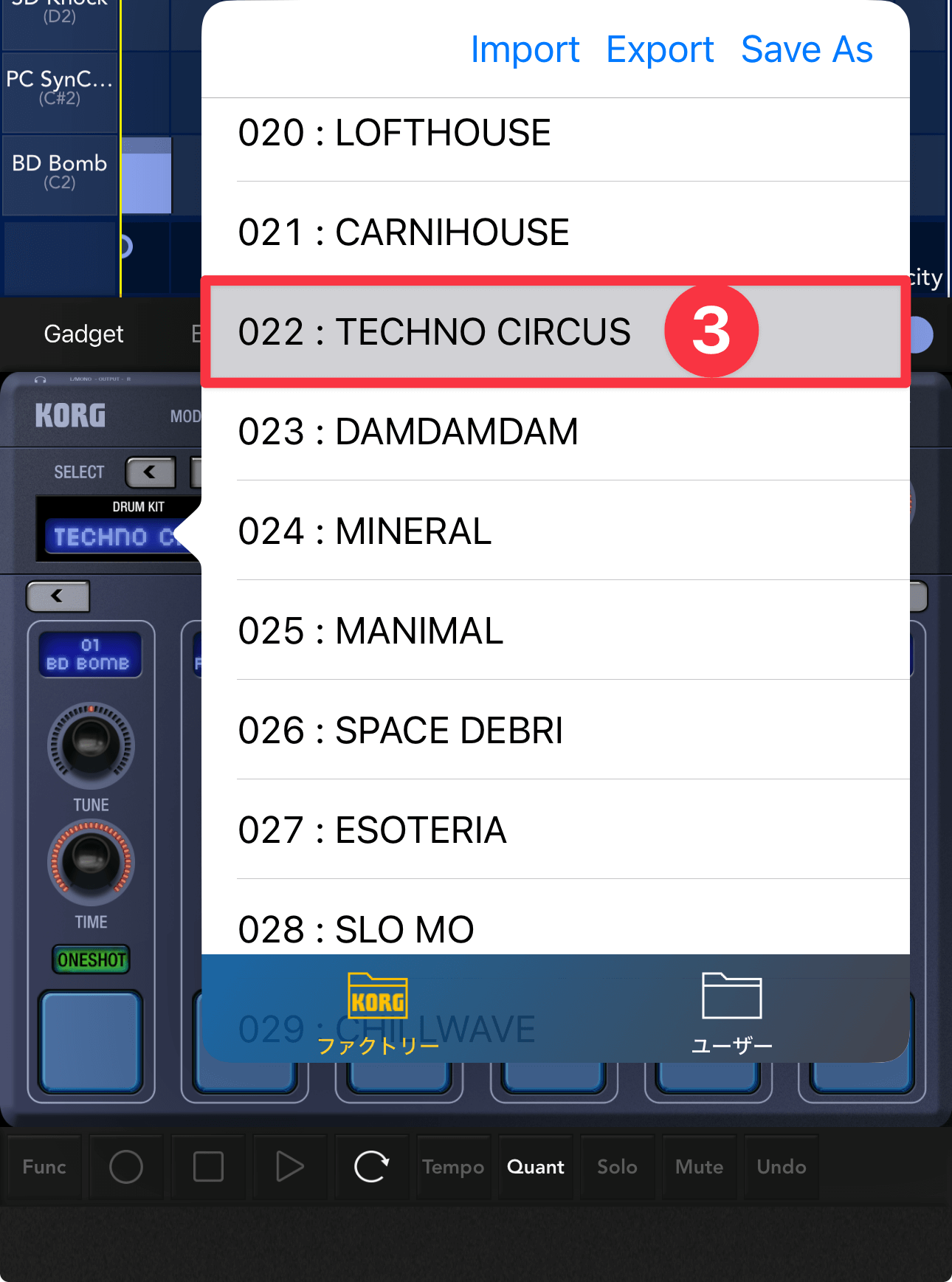 このチュートリアルでは、ドラムキット022:TECHNO CIRCUS③を使って進めていきます。下にスクロールして選んでください。