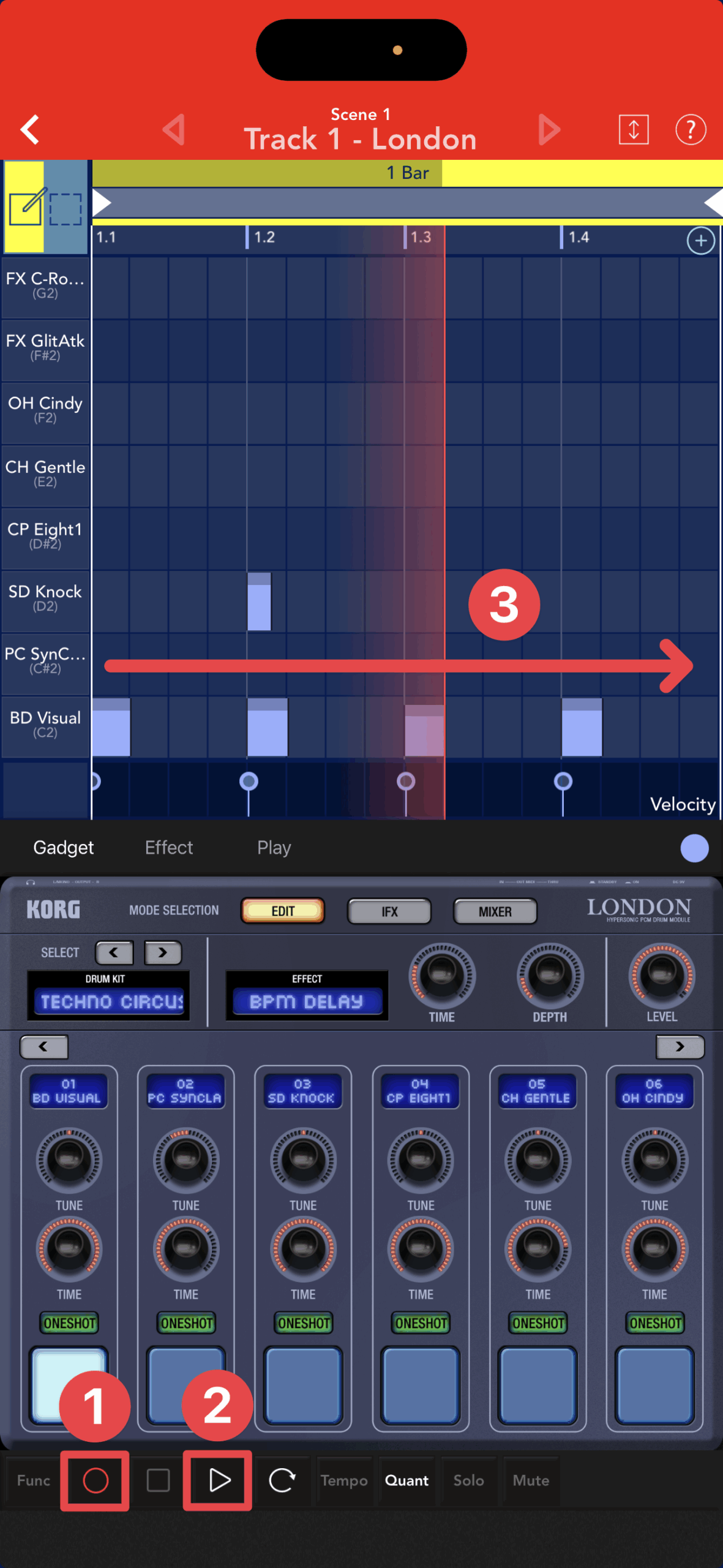 スネアの時と同じく、○(Recボタン)①タップで録音スタンバイ状態にしてから、▷(PLAYボタン)②をタップ。カウントダウン後にループ再生③が始まります。