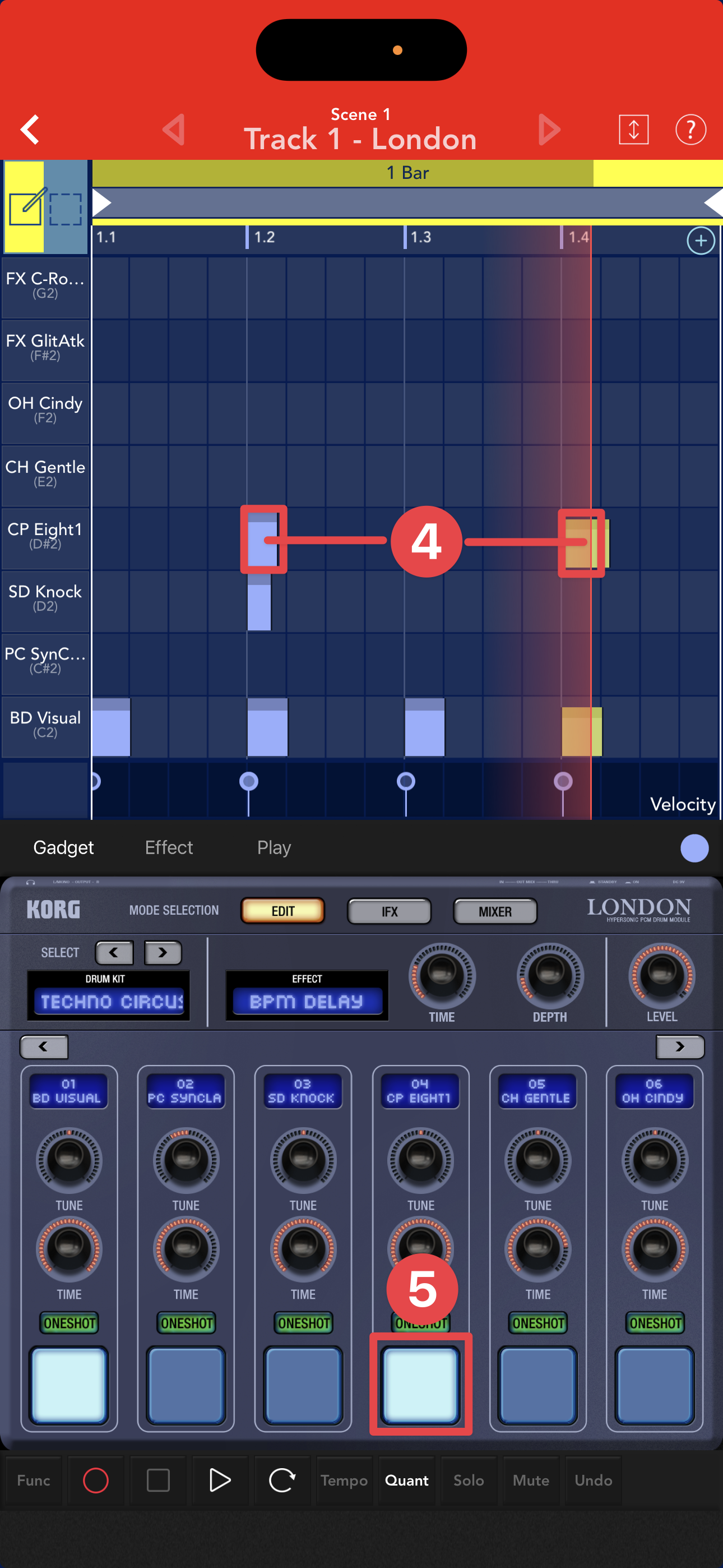 ピアノロールの5マス目と13マス目④のところで04 CP Eight1のパッド⑤をタップして、それぞれの場所にノートを打ち込みましょう。