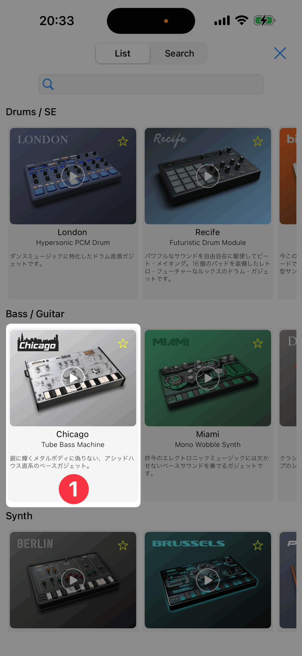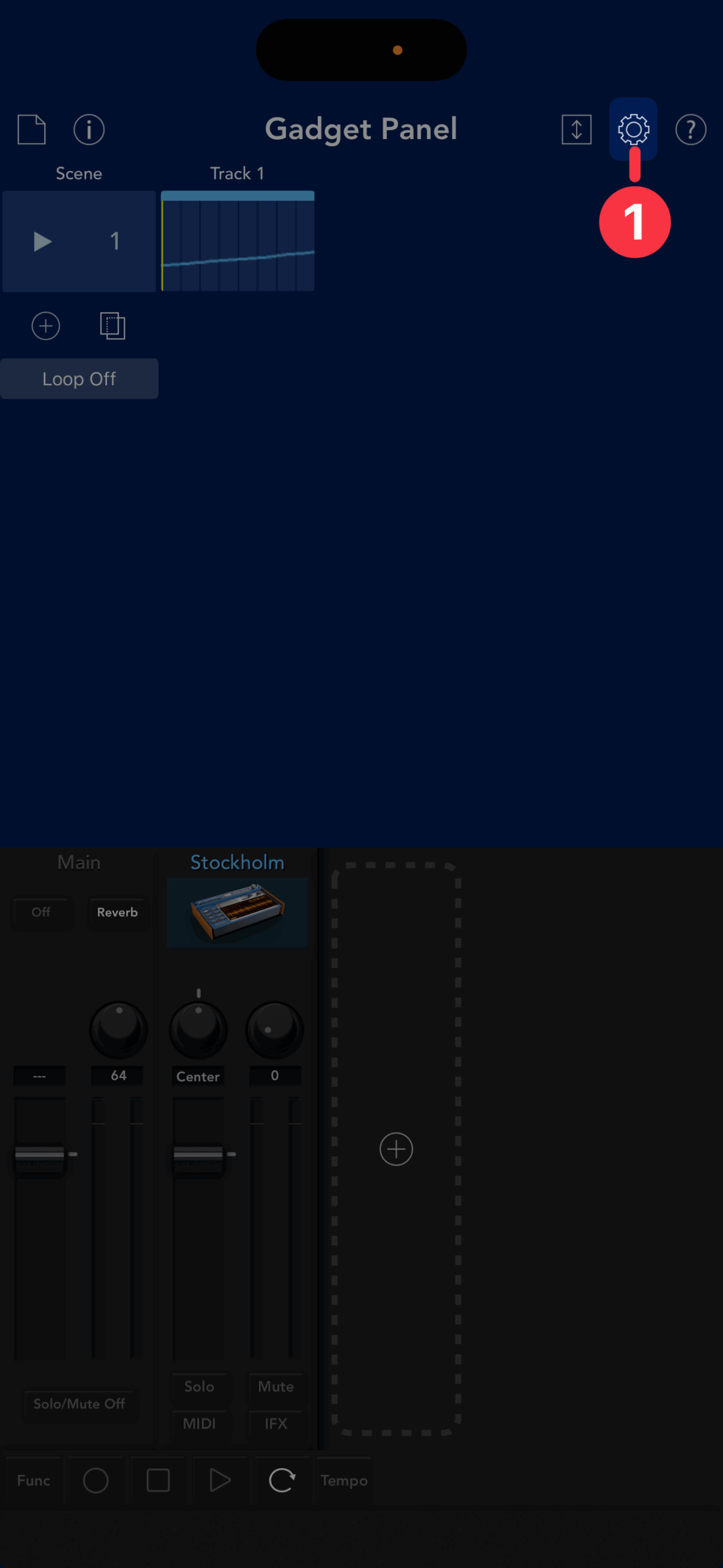 KORG Gadgetにて新規ソングを開き、なんでもいいのでガジェット楽器を立ち上げてください①。