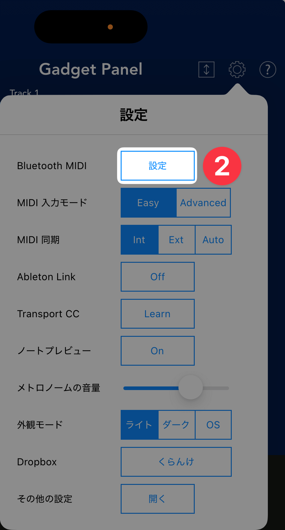 設定メニューの一番上にある、Bluetooth MIDIの設定②をタップ。