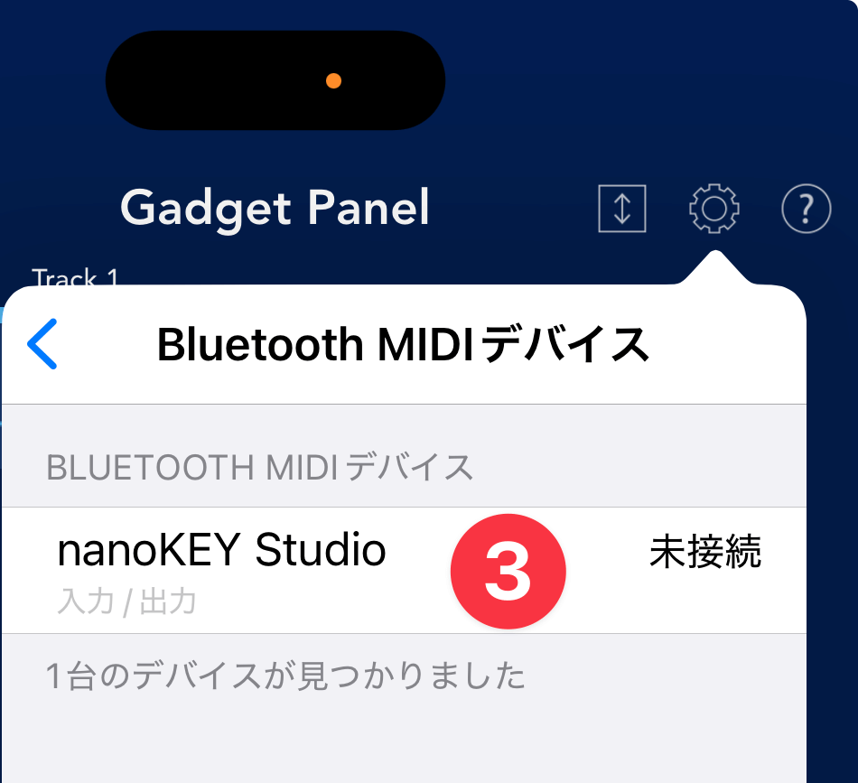 すぐにiOSデバイスがnanoKEY Studioを認識しますが、まだ未接続です。接続するためにnanoKEY Studio③をタップしてください。