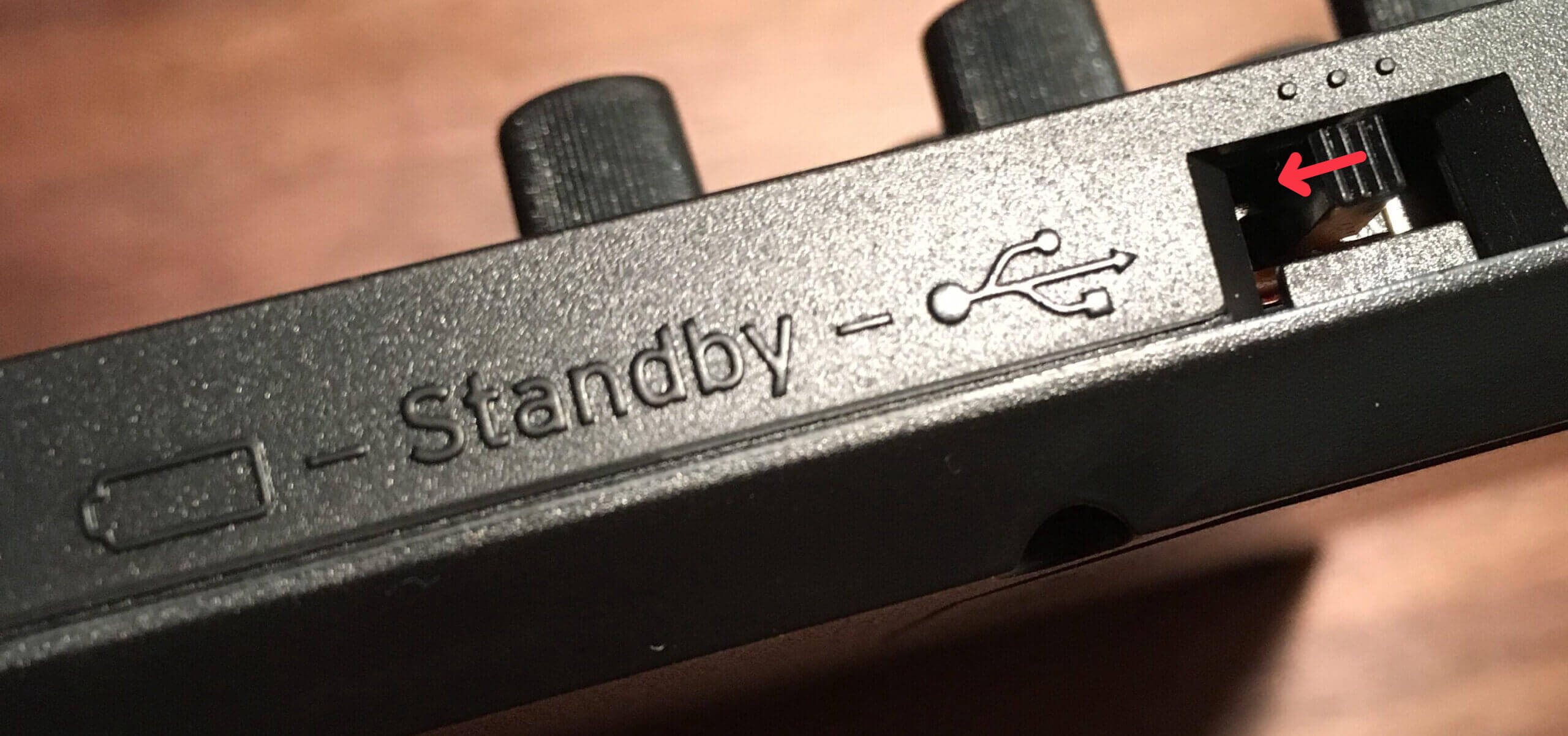 電源を切るときは、本体うしろの切替スイッチを中央(Standby)にします。電源が切れて本体右上のLEDが消えます。