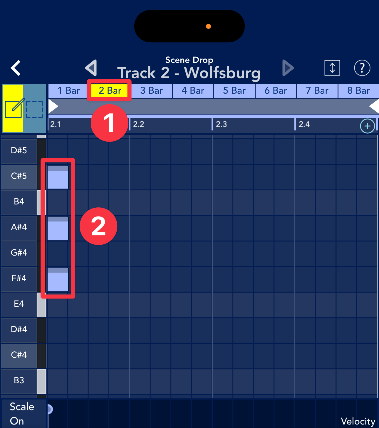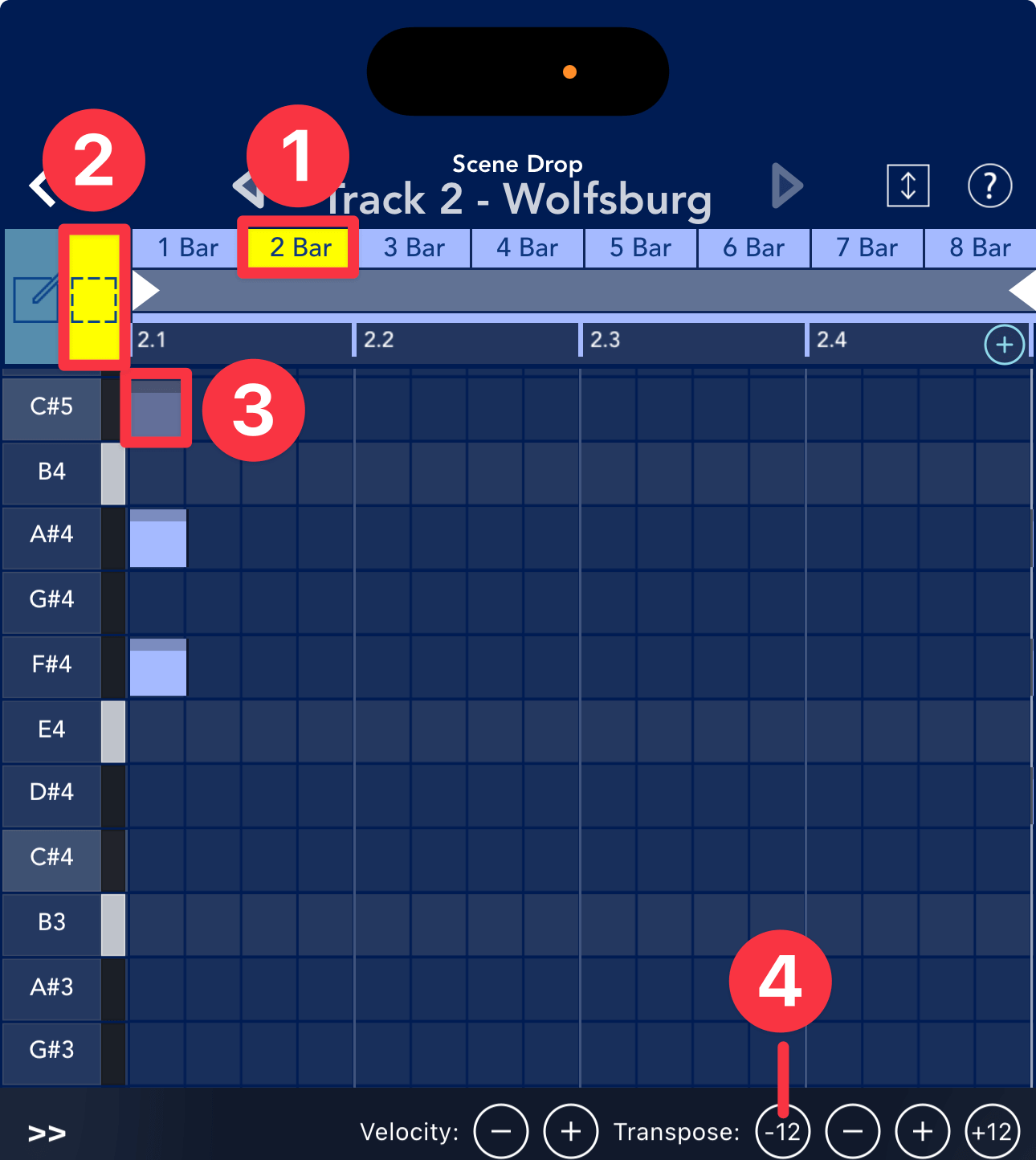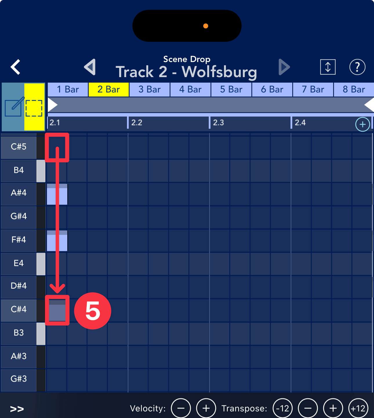 2 Bar①へ移動してSelectモード②に切り替え、C#5のノートを選択③。ピアノロール下に現れるツールのうち、Transposeの-12ボタン④をタップしてください。1オクターブ下のC#4⑤に移動します。