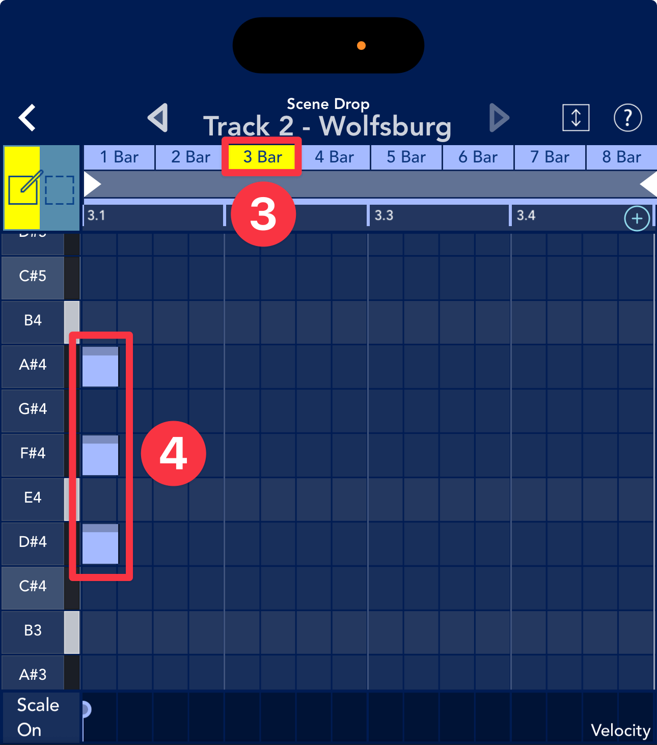 3 Bar③に移動し、1マス目にD#4,F#4,A#4④と打ち込んでください。コードD#mができます。
