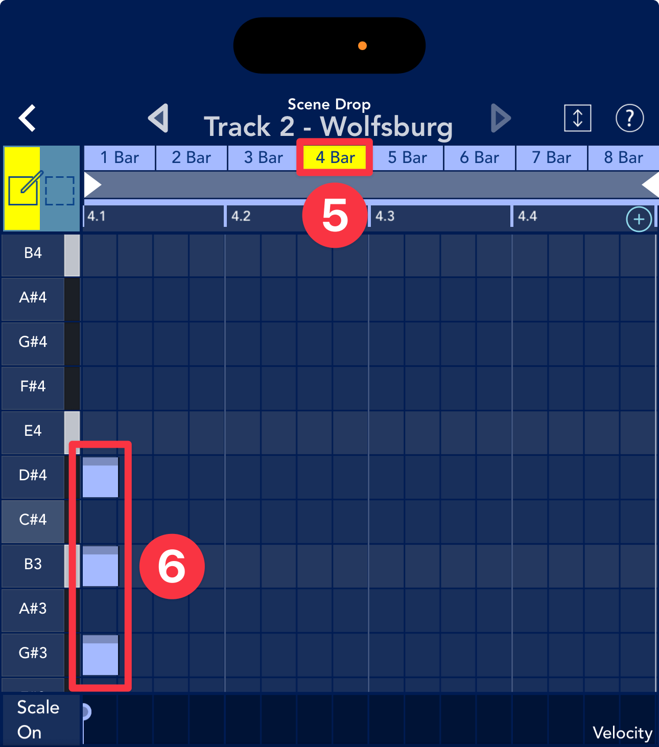 4 Bar⑤に移動し、1マス目にG#3,B3,D#4⑥と打ち込んでください。コードG#mができます。