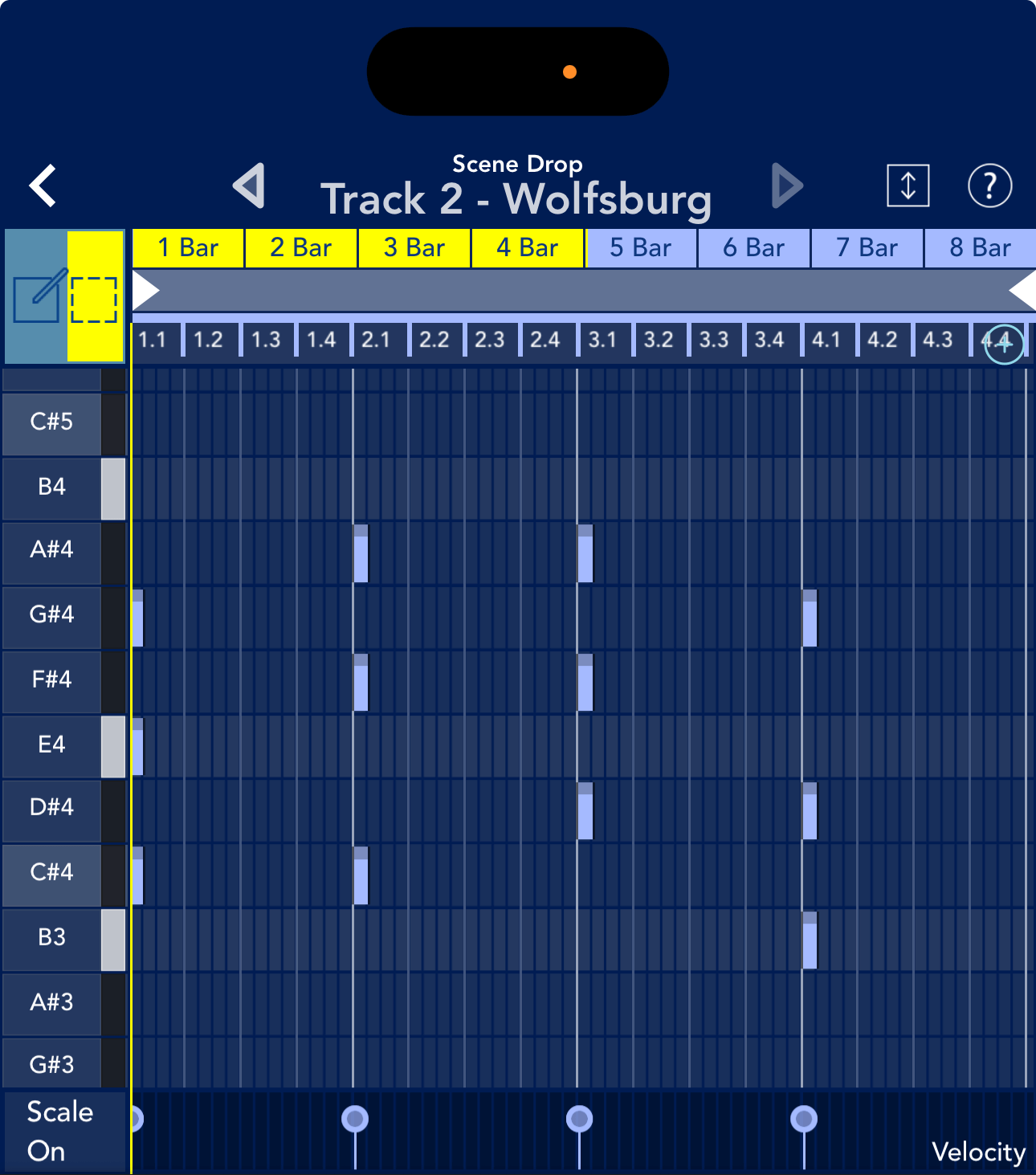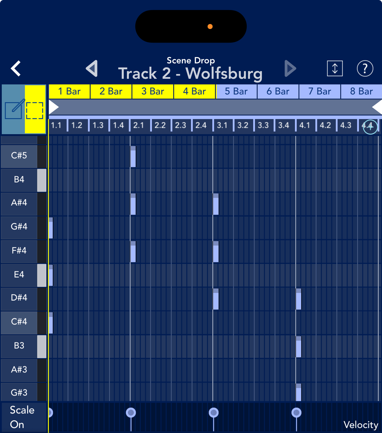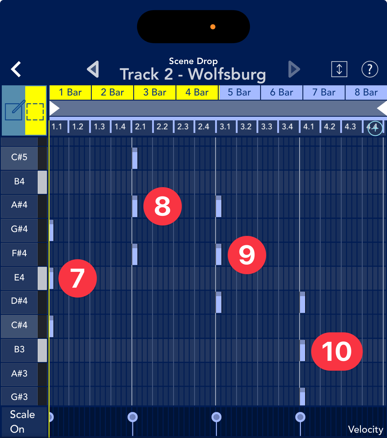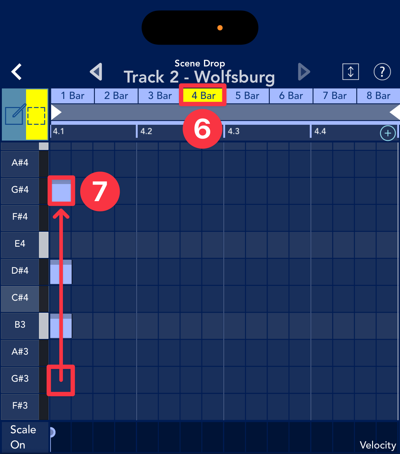 続いて4 Bar⑦へ移動し、今度はG#3のノートを1オクターブ上げてください⑧。