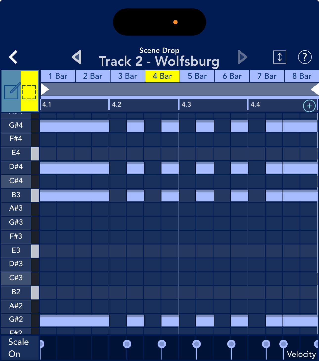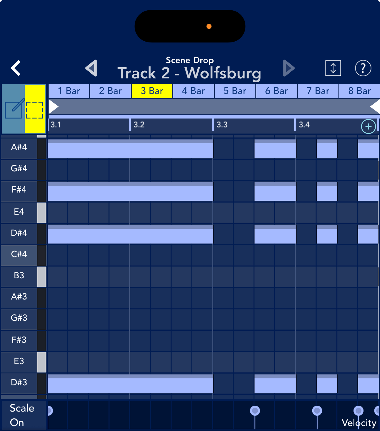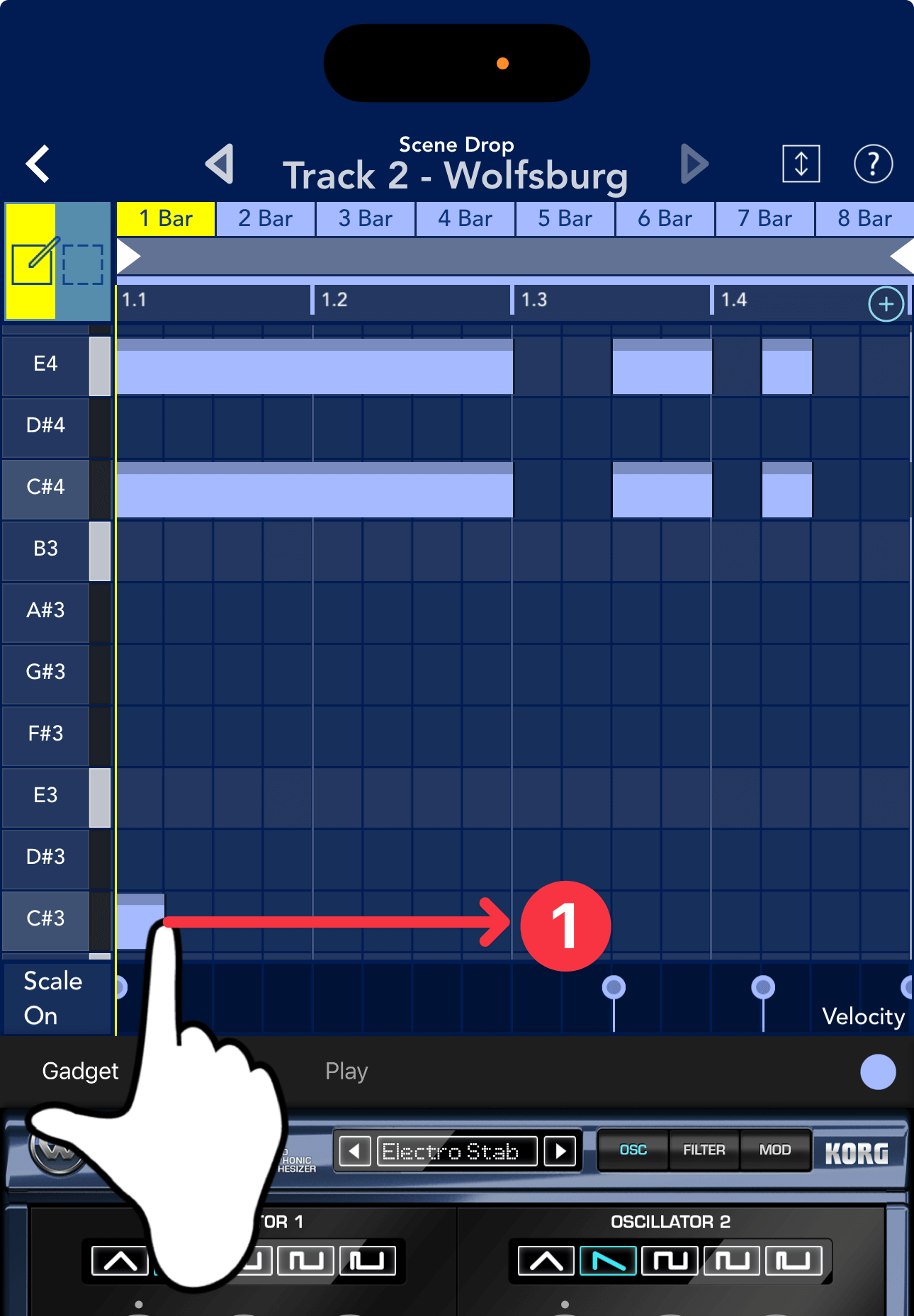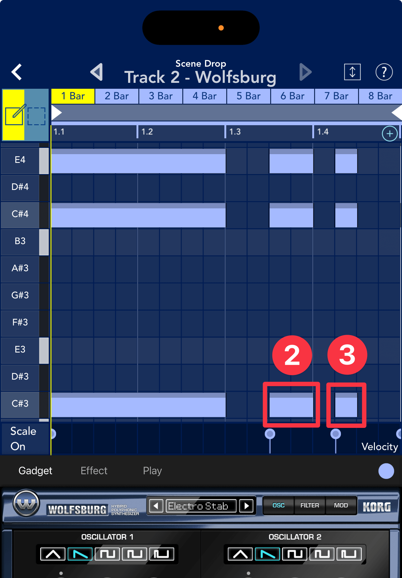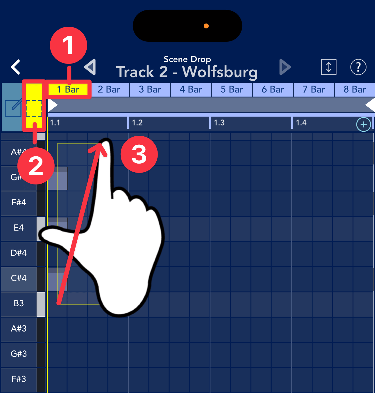 C#3の1マス目にて、タップしたまま右へドラッグ①すると、ノートを一気に伸ばせます。そして先ほどと同じように、②と③のノートも入力してください。