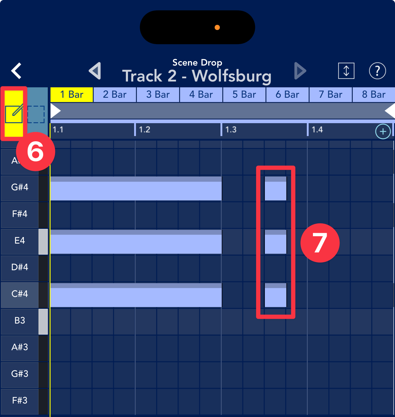 どれかひとつのノートの右はしを長押しした後、右へドラッグ④すると、選択したノートを伸ばすことができます。ここでは1.3⑤のところまで伸ばしてください。