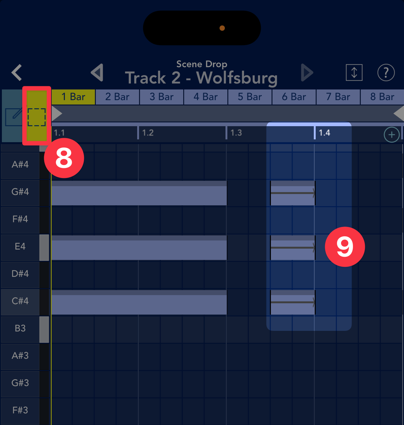 Drawモード⑥に切り替え、ピアノロール11マス目⑦でノートを打ち込み、Selectモード⑧で先ほどと同じように複数選択してから1.4のところまで伸ばします⑨。