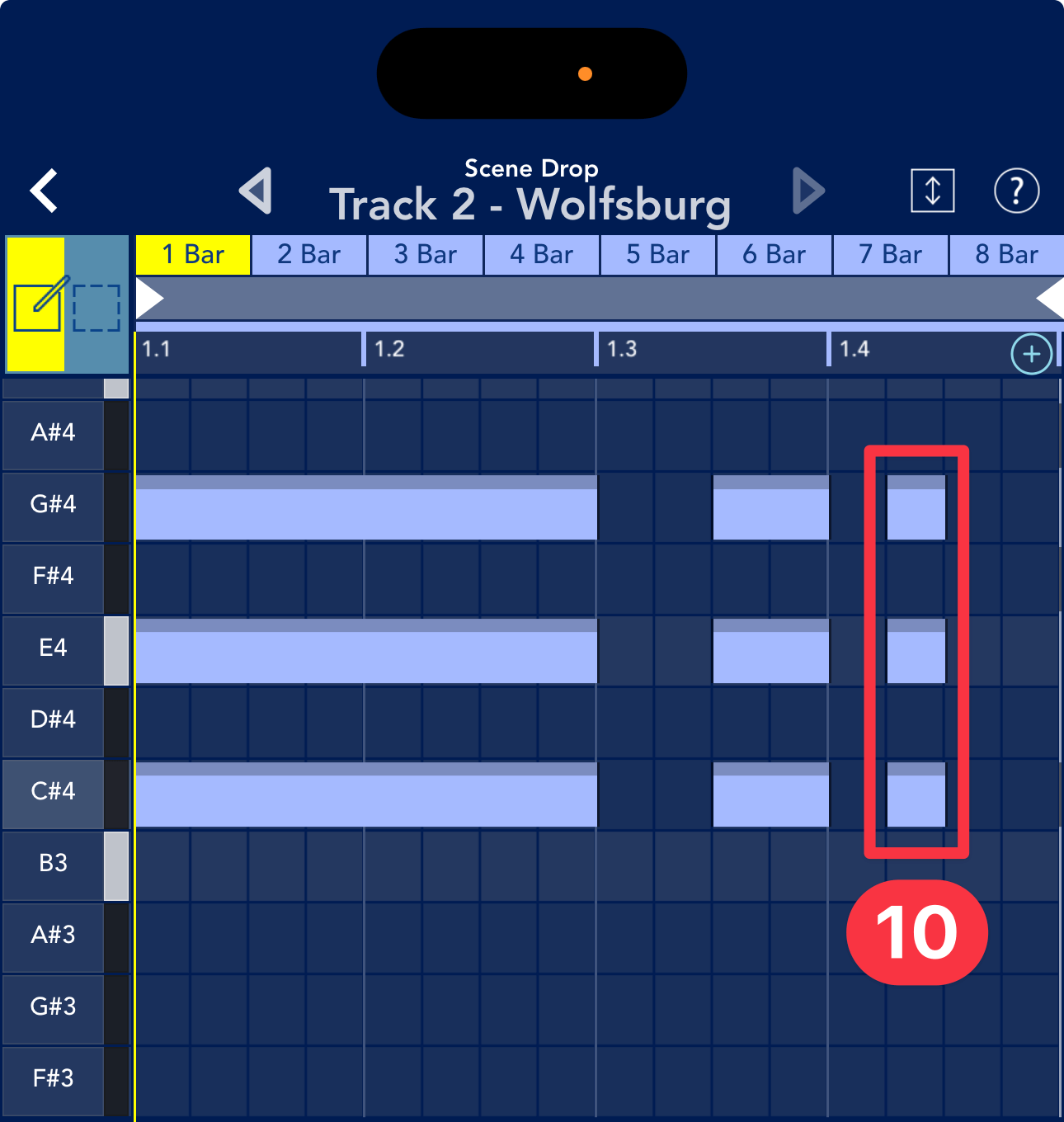 14マス目⑩にノートを置けば、1 Barでのノートの打ち込みは完了です。