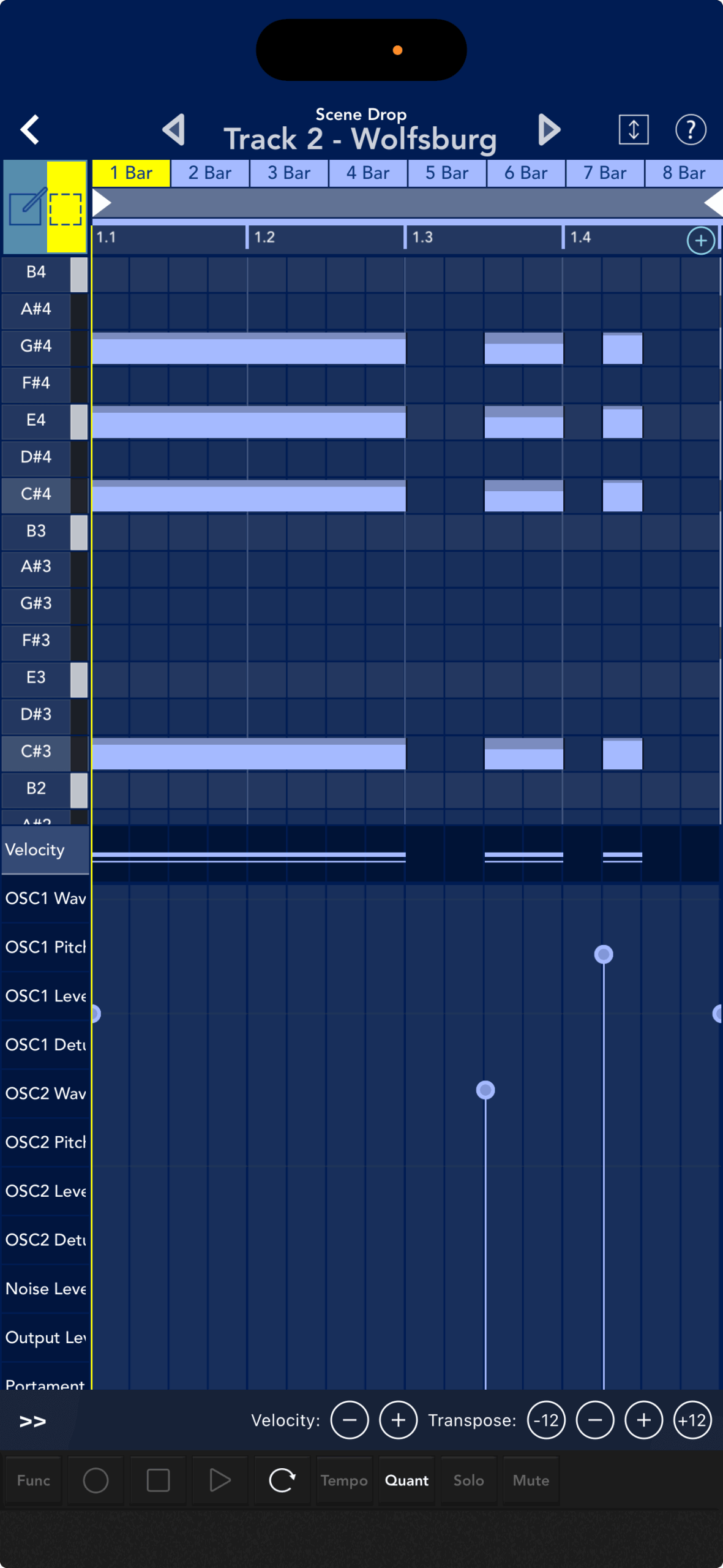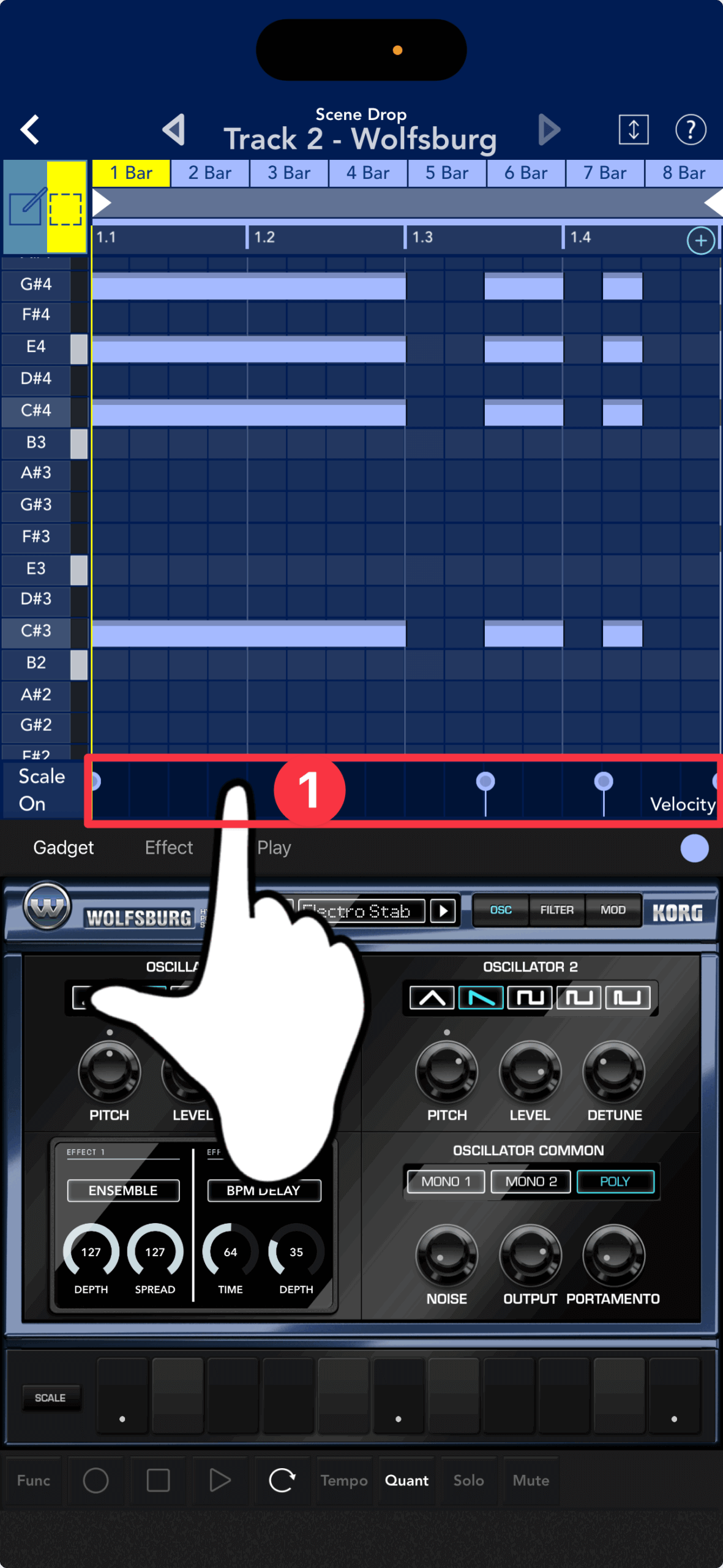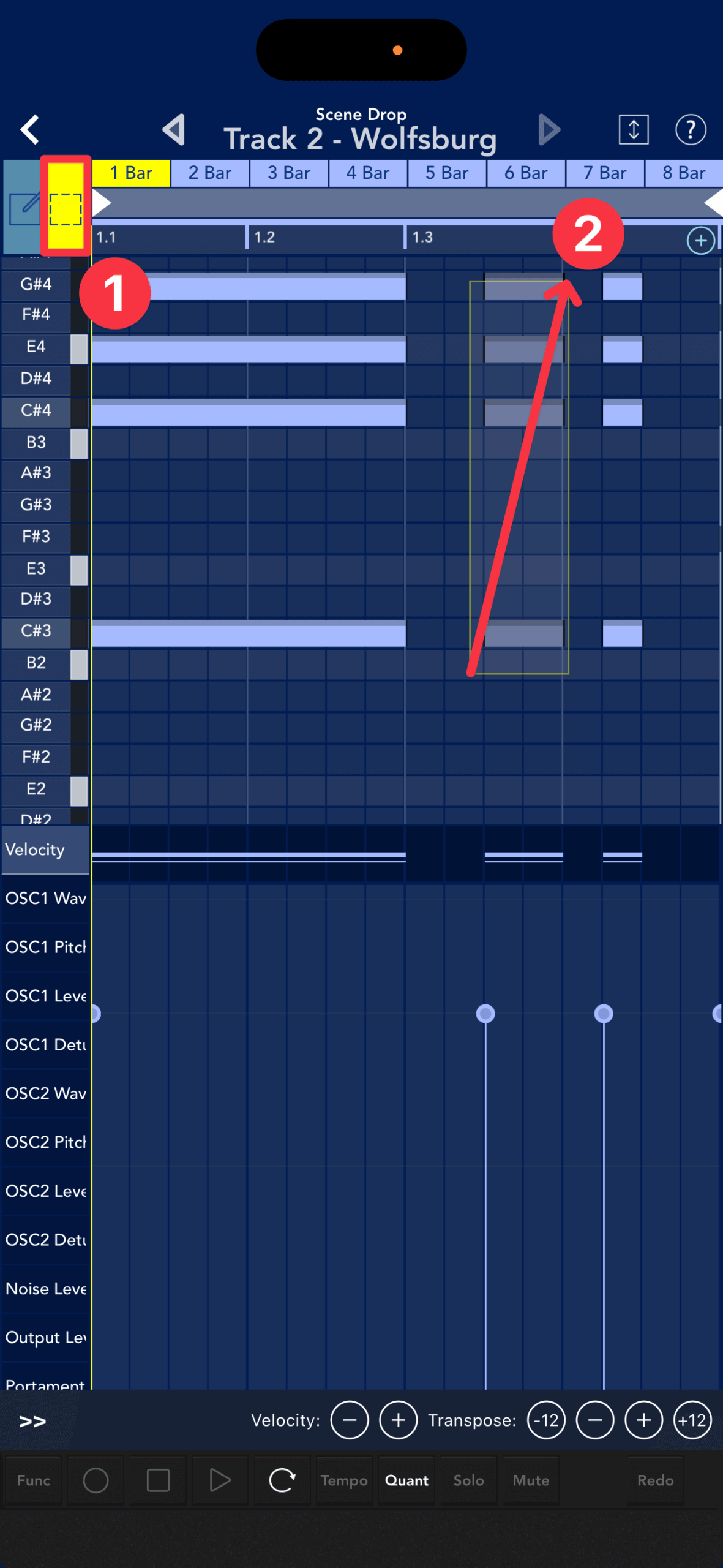ピアノロールの下にパラメーター表示部①が見えます。ここをタップすると拡大し②、パラメーターのひとつ「ベロシティー」が表示されます。どのノートも75%です。