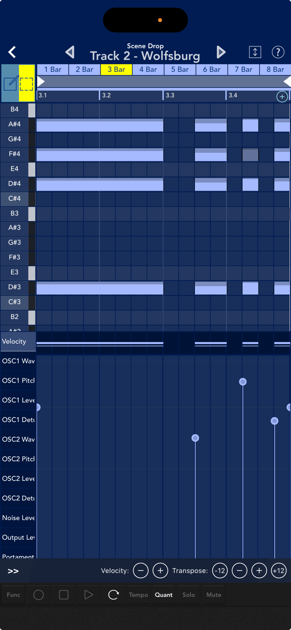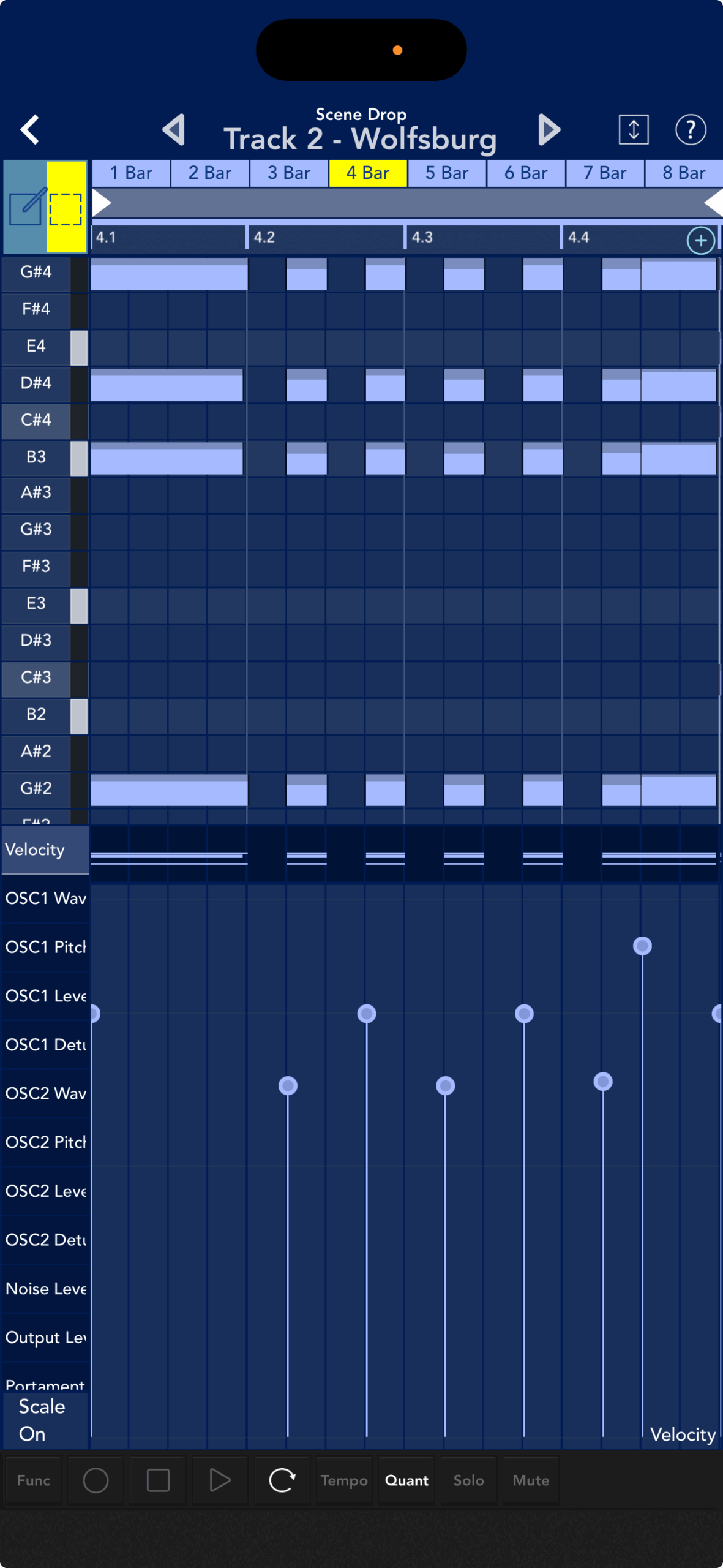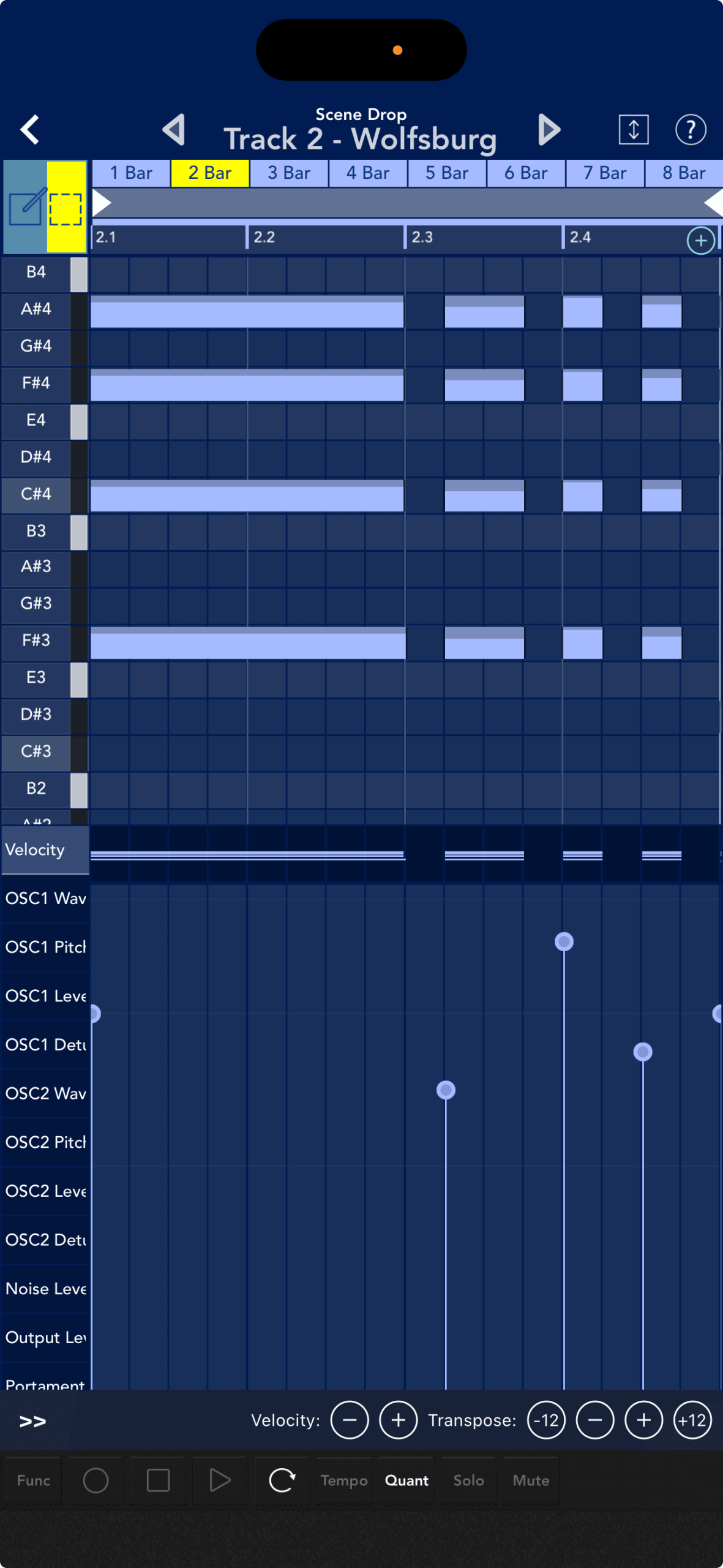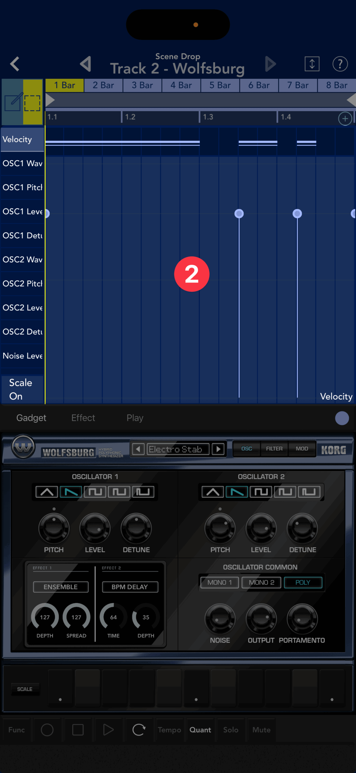 ピアノロールの下にパラメーター表示部①が見えます。ここをタップすると拡大し②、パラメーターのひとつ「ベロシティー」が表示されます。どのノートも75%です。