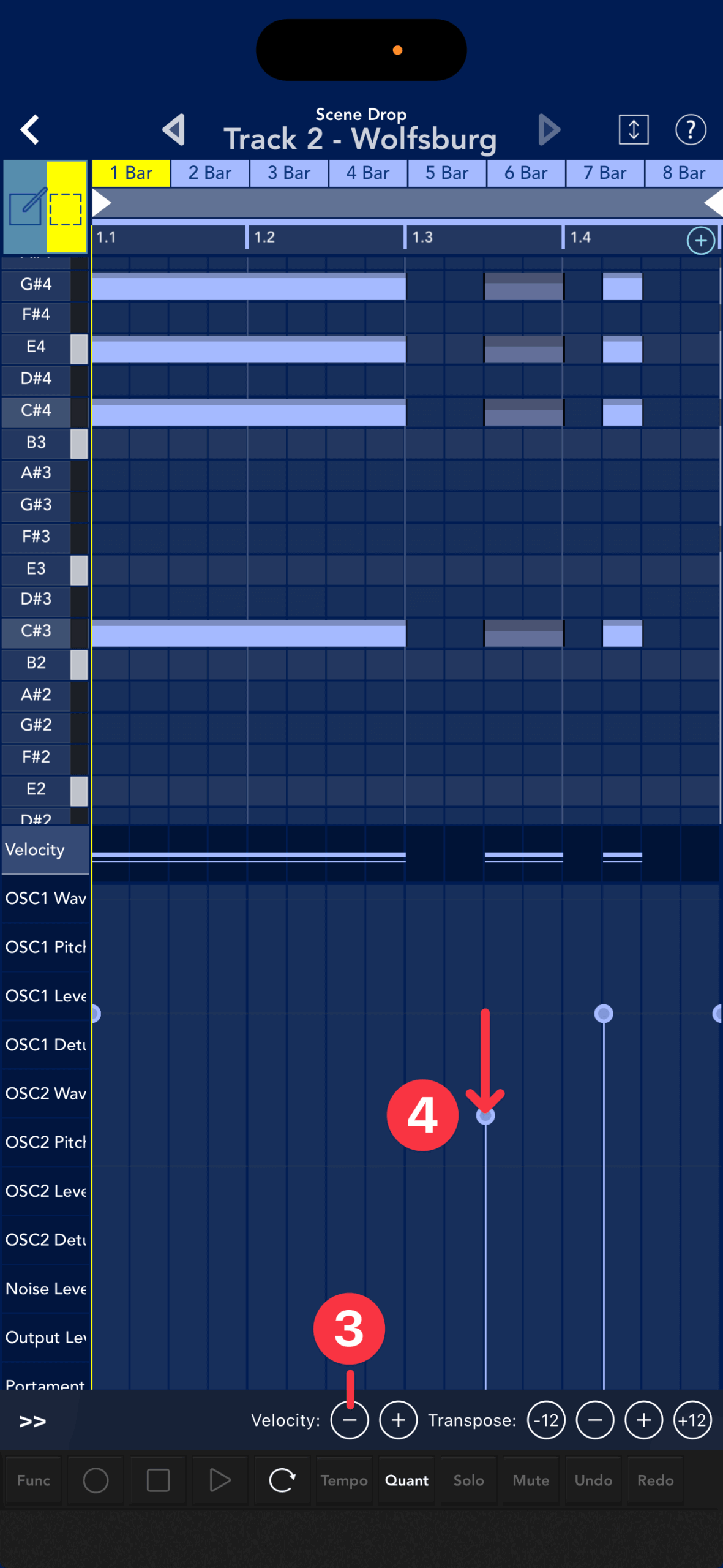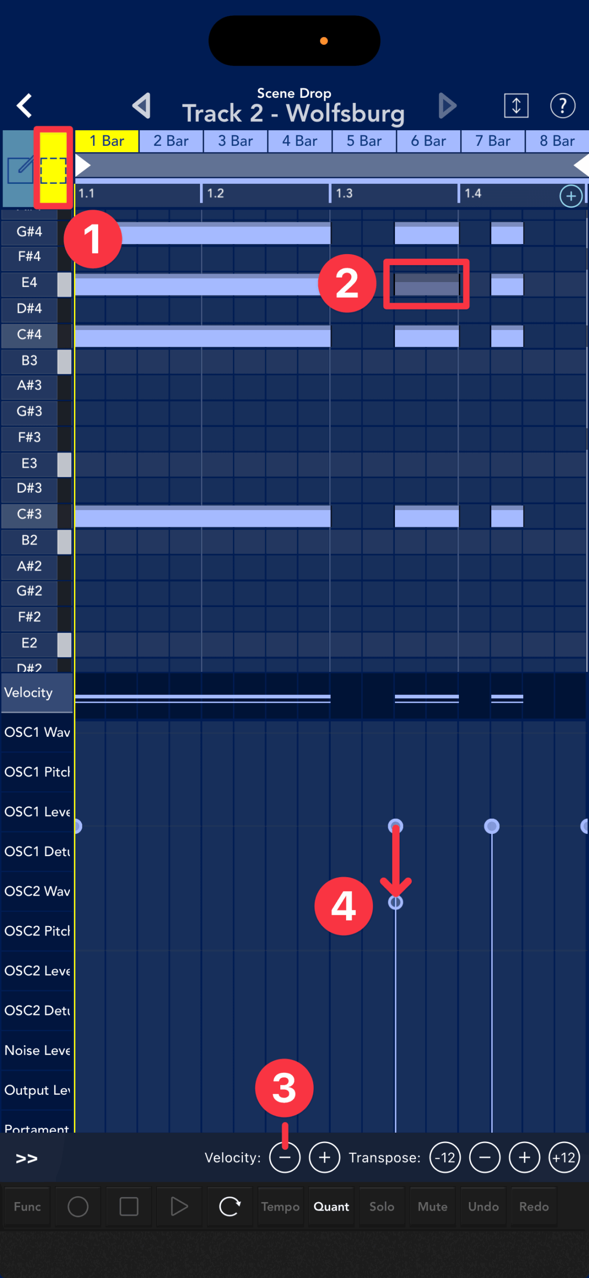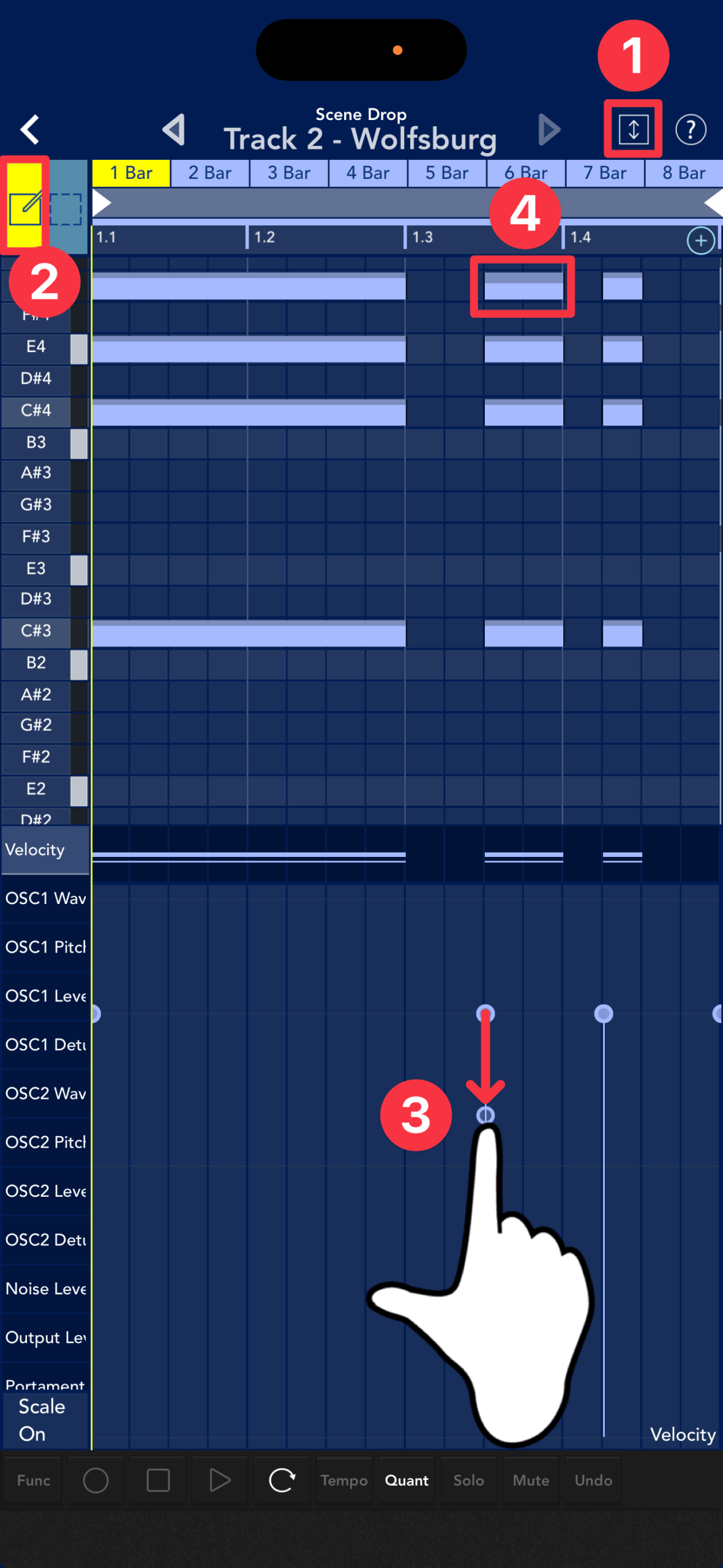 最もシンプルなやり方は、Drawモード②に切り替え、パラメーターの先端③をドラッグして上げ下げすることです。今回のように同じタイミングでノートが重なる時は、一番高いノート④だけ上げ下げされます。