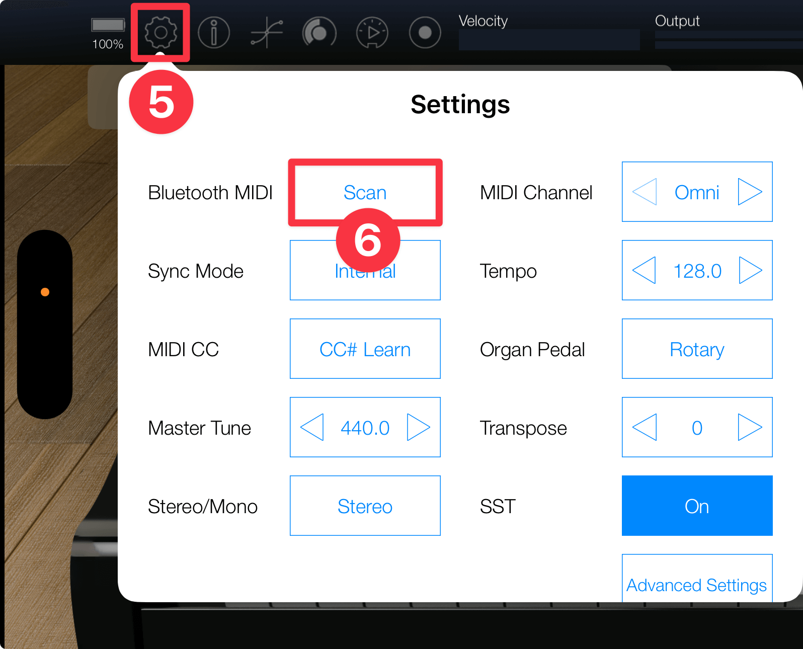 iOSデバイスでKORG Moduleを起動します。設定⑤をタップして、Bluetooth MIDIにあるScan⑥をタップします。