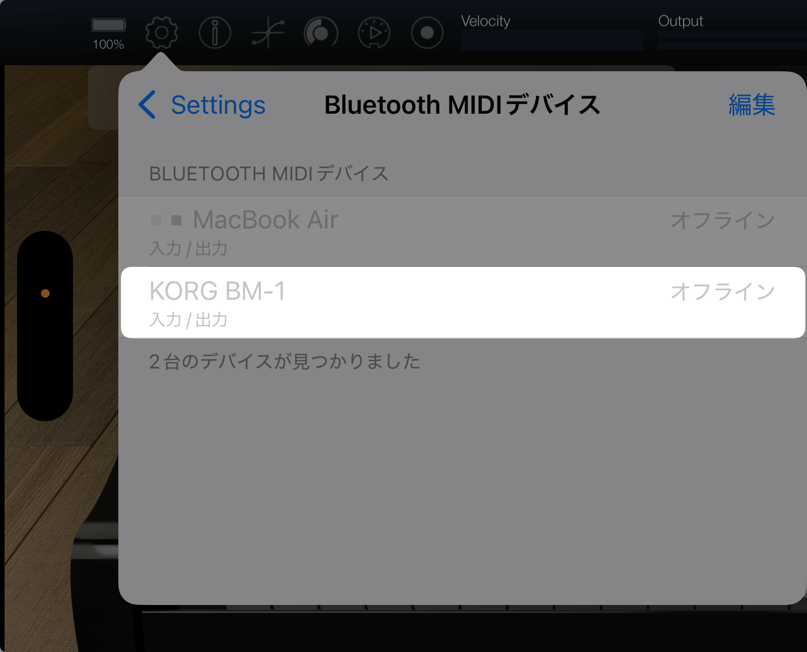 iOSデバイスでKORG Gadgetを起動します。すぐにFound BLE-MIDI Device KORG BM-1④と表示され、BM-1がBluetooth MIDIデバイスとして認識されます。しかし、まだ未接続です。