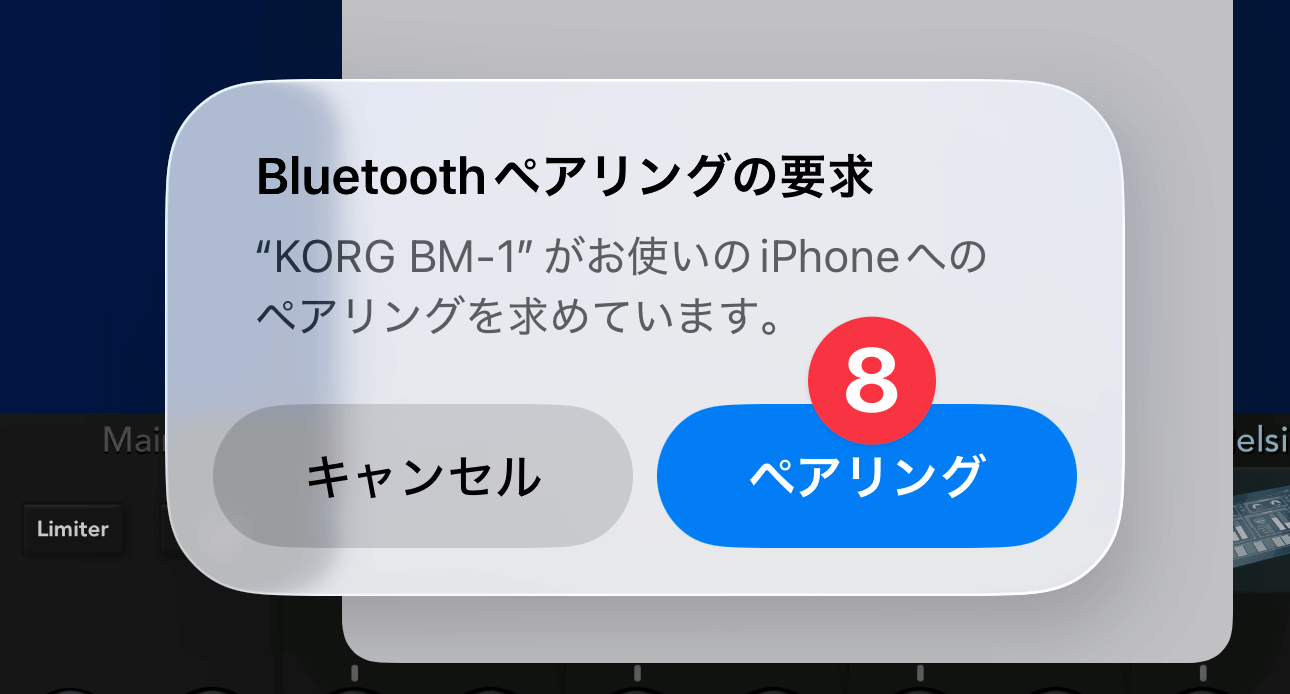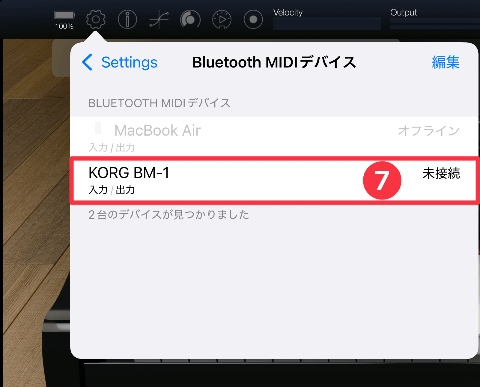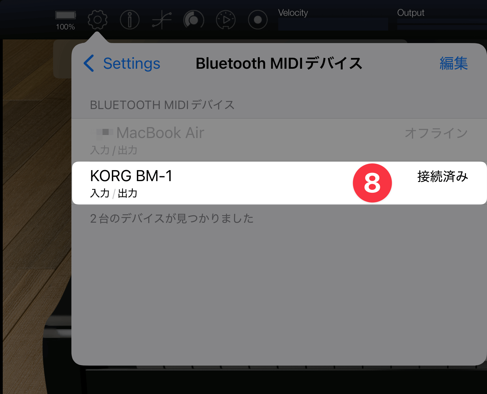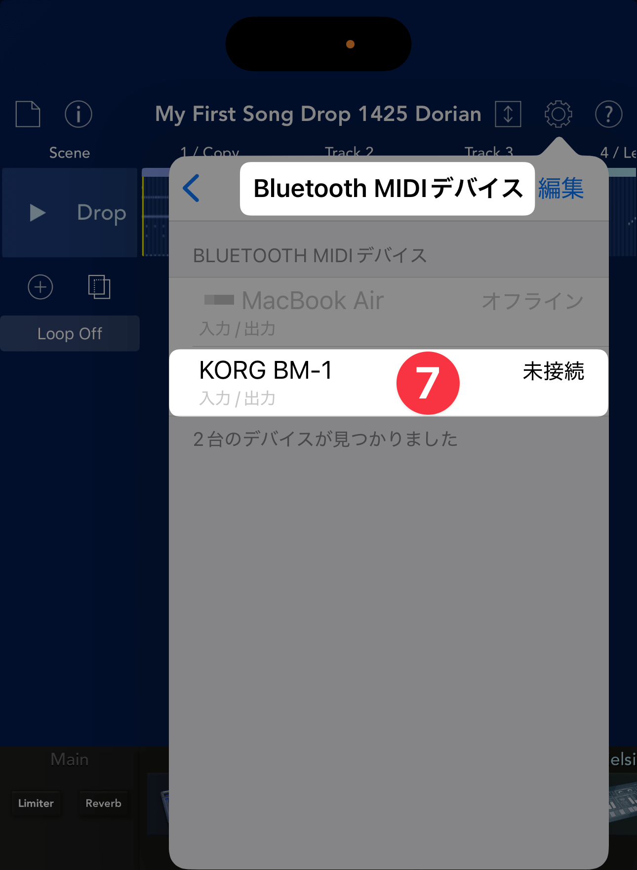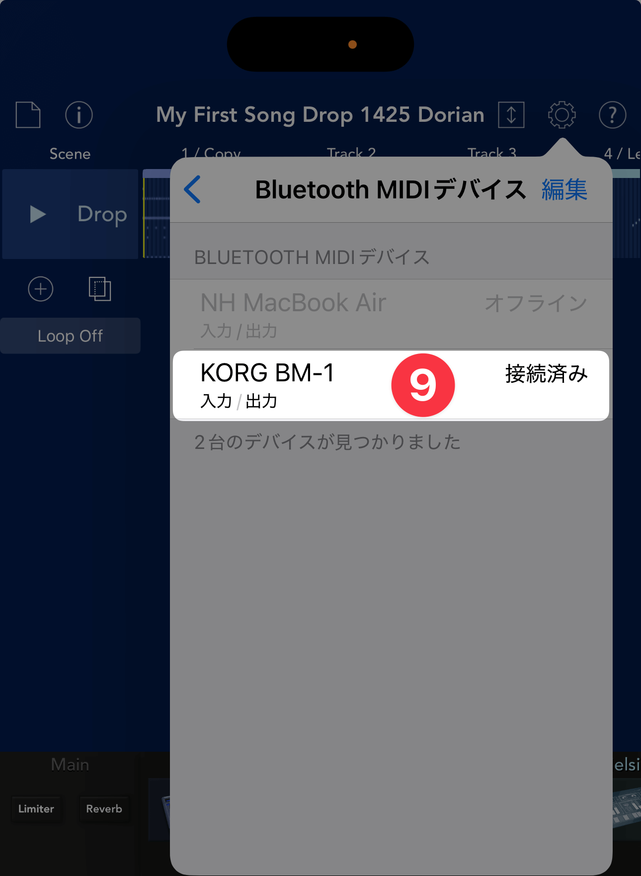 Bluetooth MIDIデバイスとしてKORG BM-1が検出されるので、未接続⑦をタップすると接続済みになります⑧。