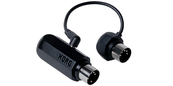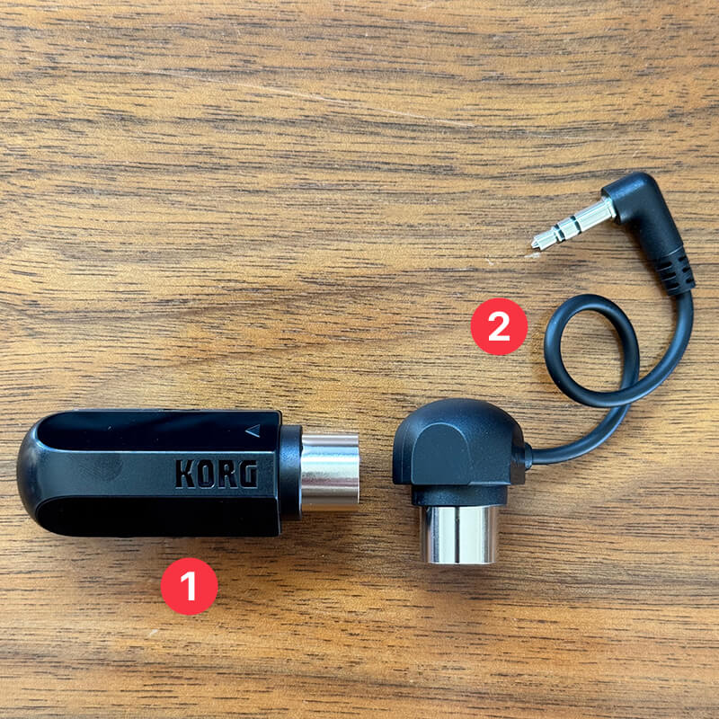 KORG BM-1は、5ピンDINのMIDI OUT端子を備えたメインアダプター①と、MIDI IN端子付きのサブアダプター②で構成されます。