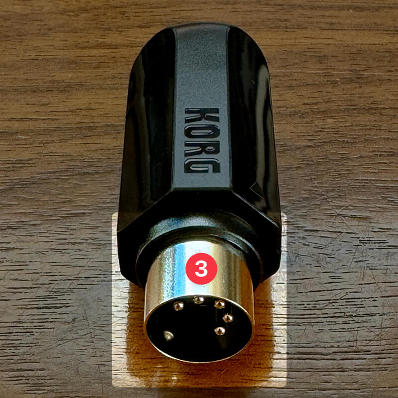 メインアダプターのMIDI OUT端子③です。MIDIデバイスのMIDI OUT端子に接続すると給電され、電源がOnになります。