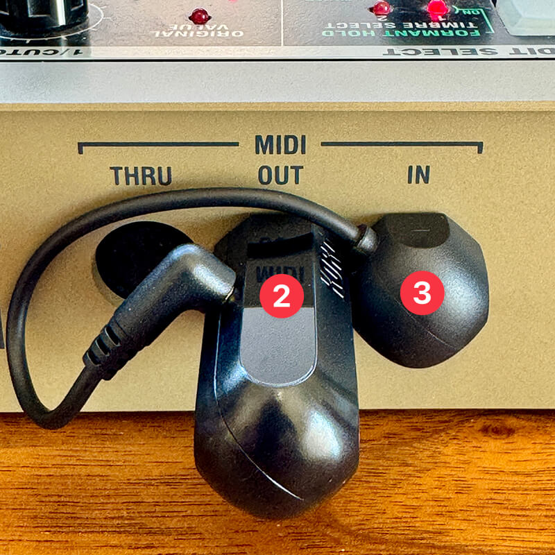 MIDI端子付きシンセのMIDI OUT端子にメインアダプター②、MIDI IN端子にサブアダプター③を接続します。