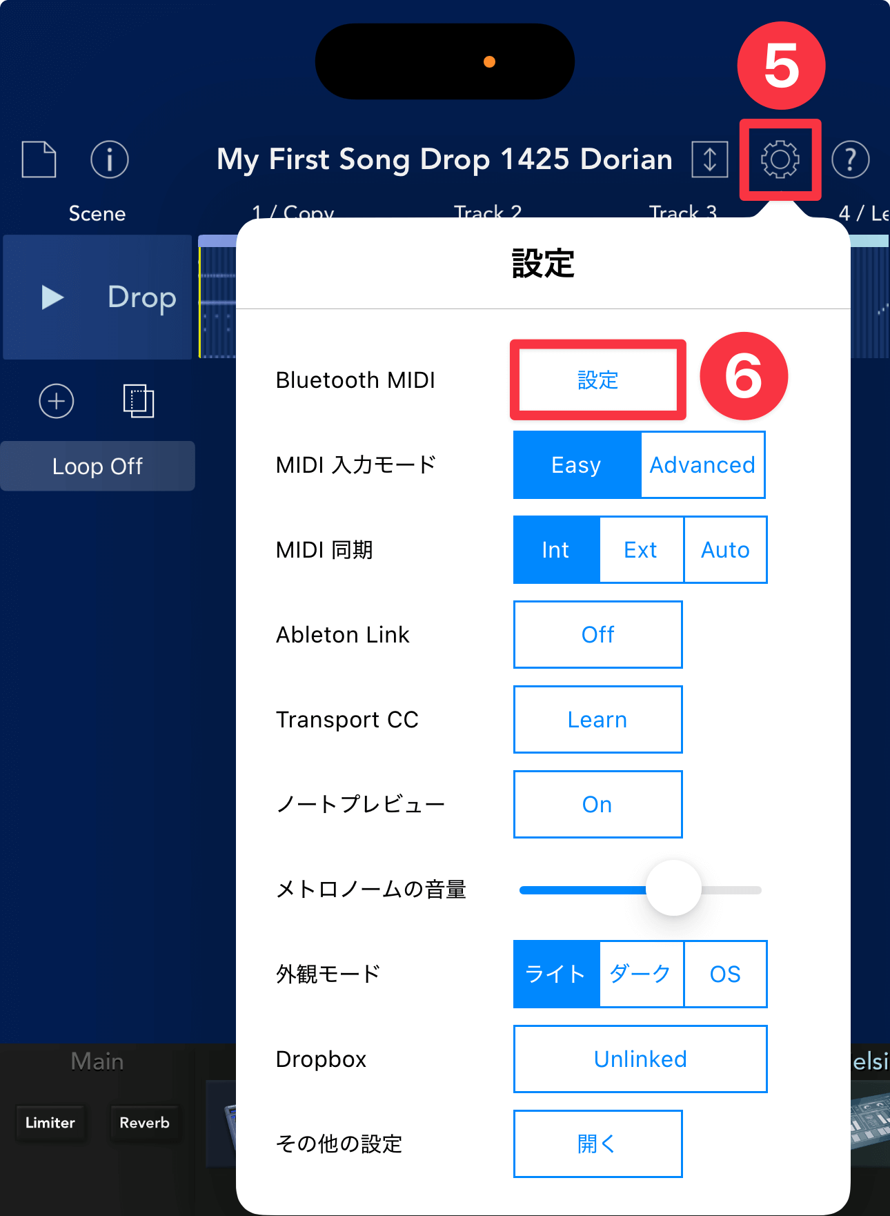 設定⑤を表示しBluetooth MIDI⑥をタップ。KORG BM-1がBluetooth MIDIデバイスとして認識されているのでタップします⑦。