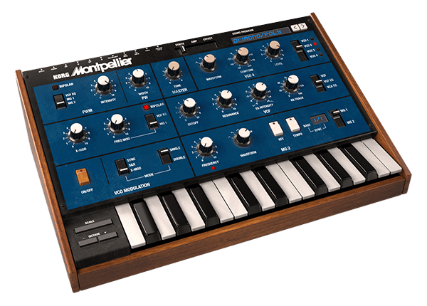 KORG Mono/Poly。4 VCOの分厚いサウンドが持ち味で、クロス・モジュレーションとオシレーター・シンクで多彩な音作りが行えます。