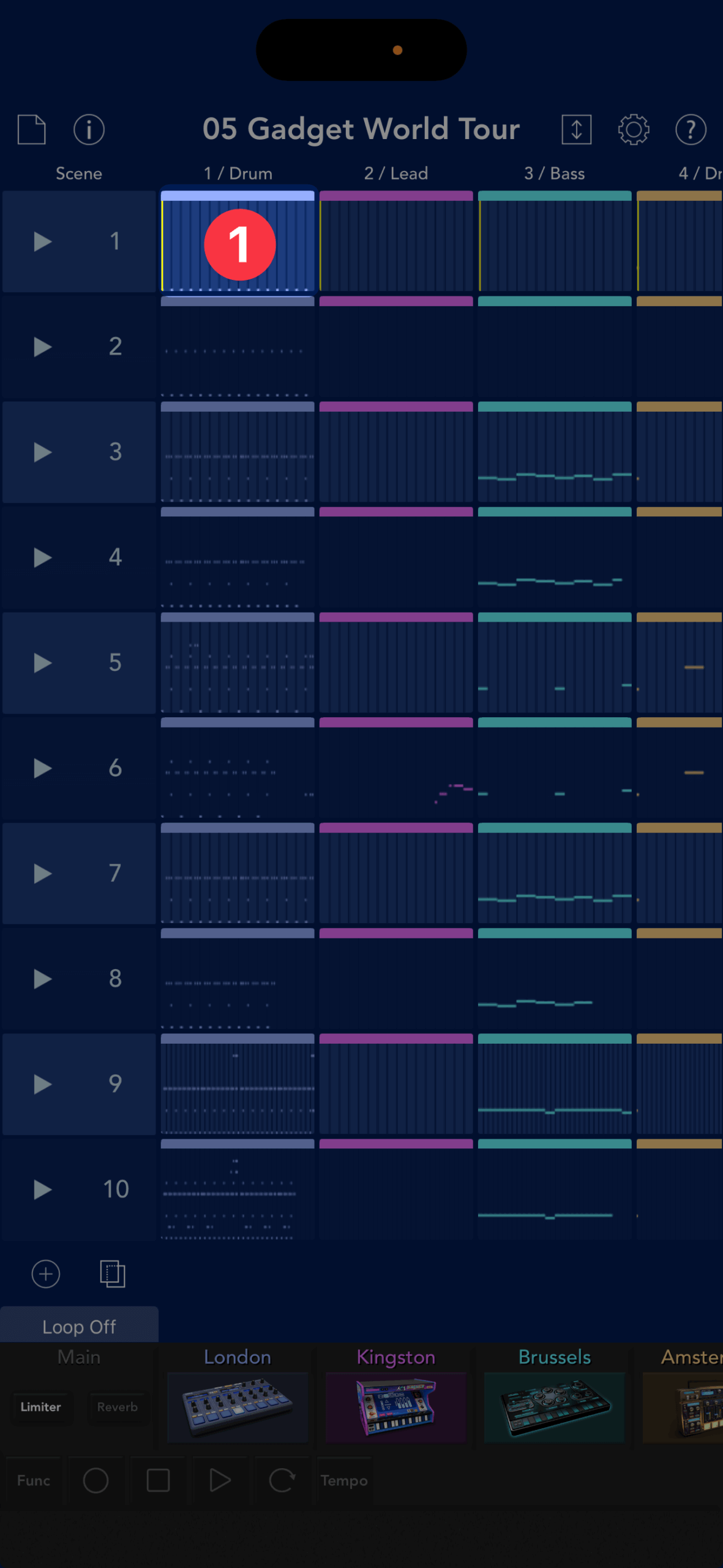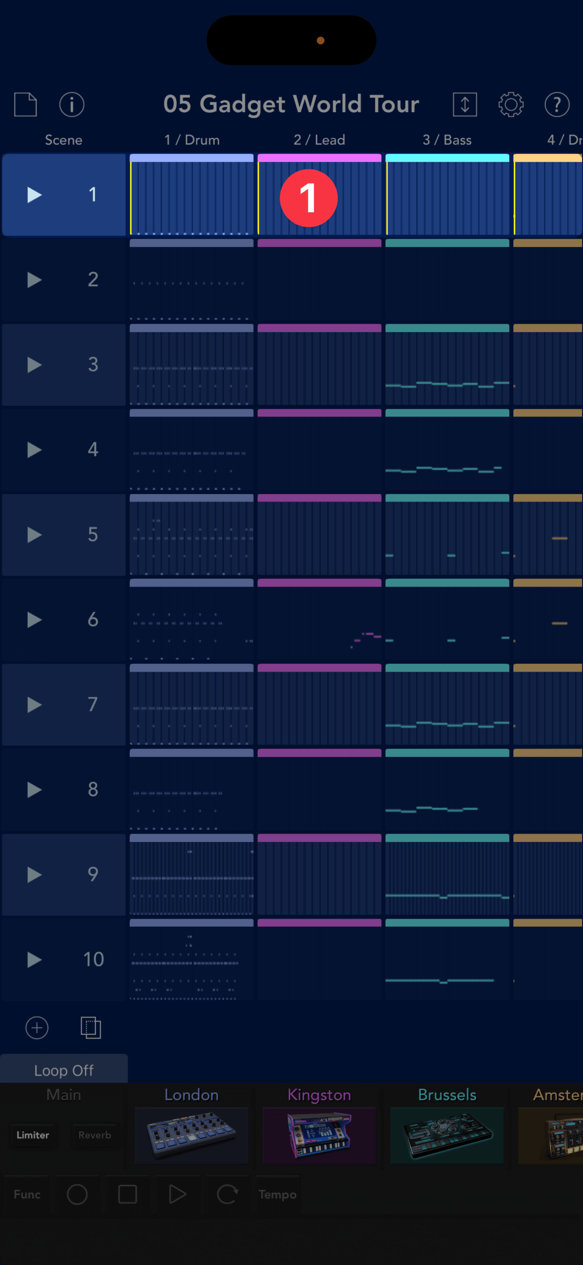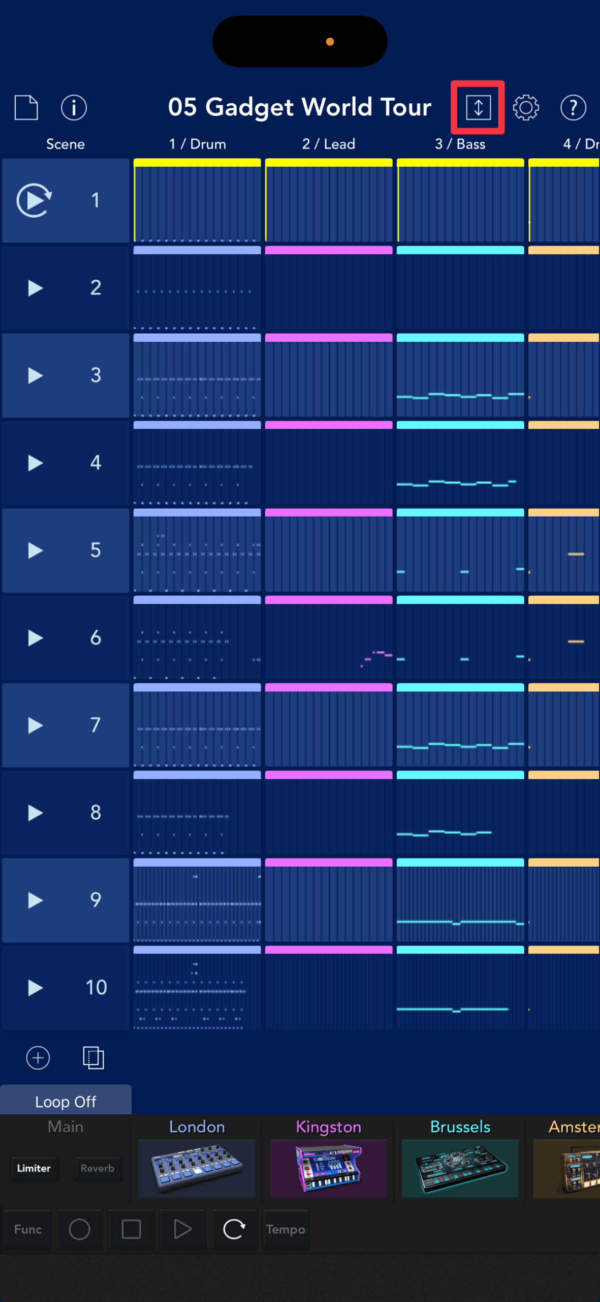 KORG Gadgetは時間がタテに進んでいきます。つまり「シーン1」のプレイが終わると、その下にある「シーン2」へと移っていきます。このとき下のシーンに移らず、同じシーンの再生を繰り返したい時にLoopをオンにします。