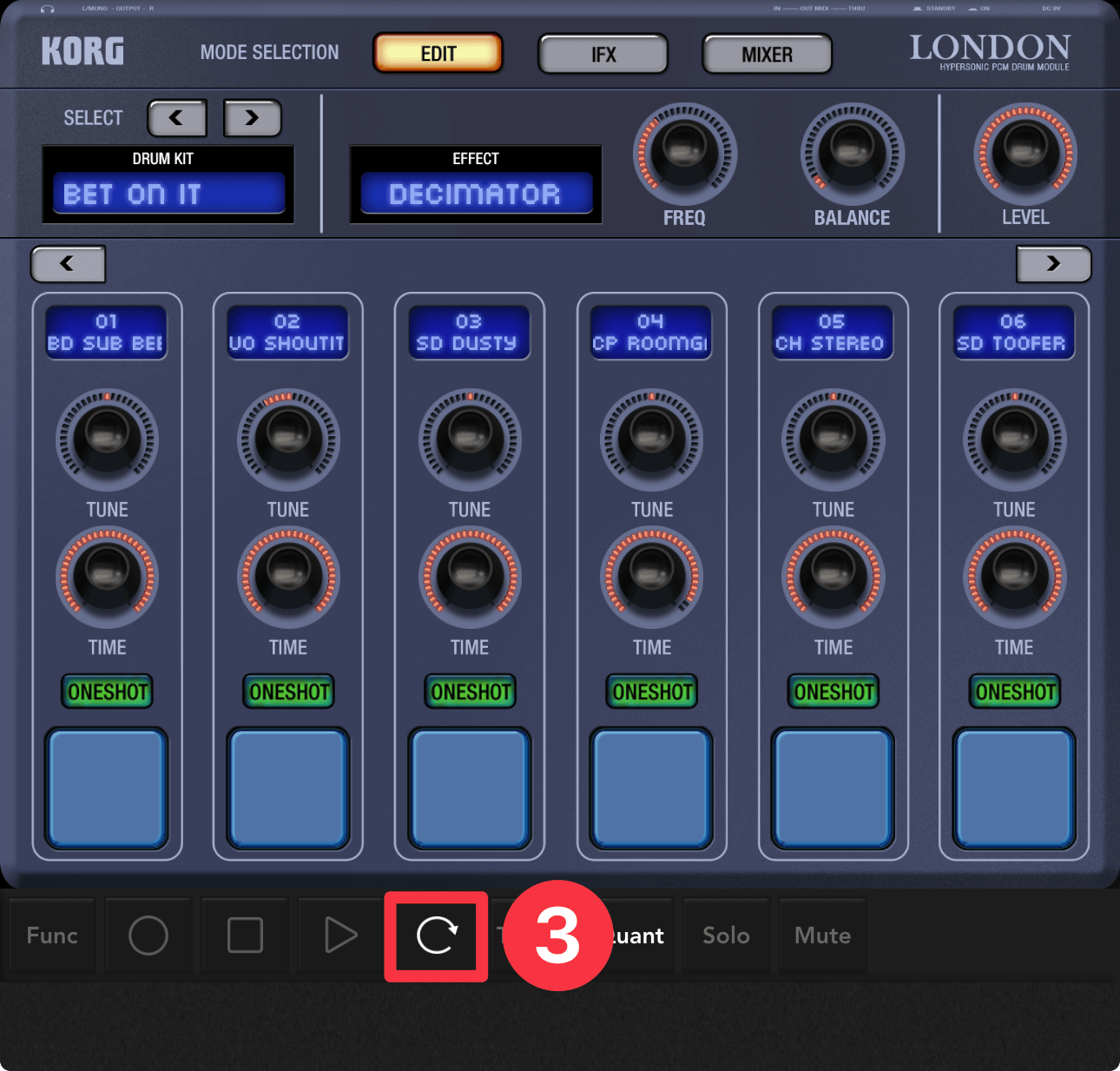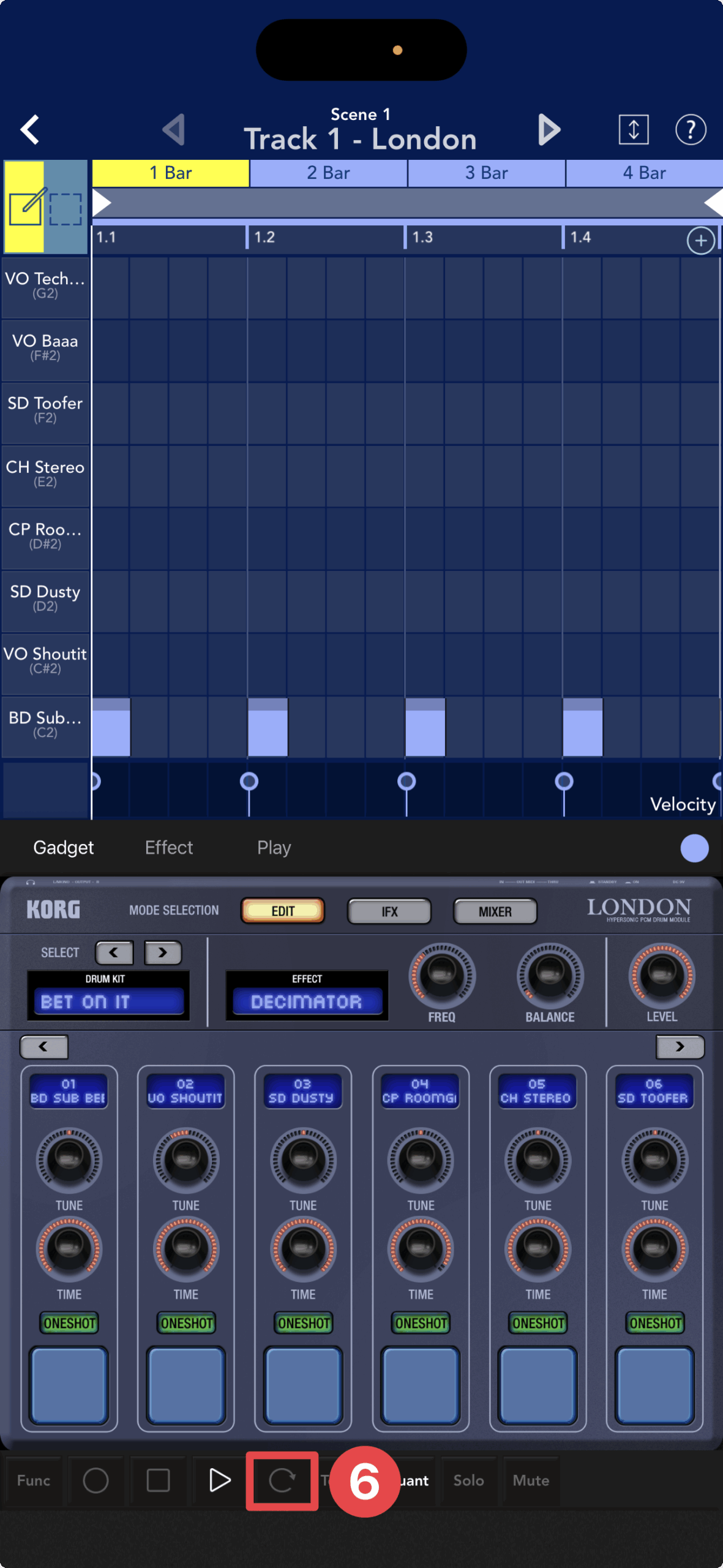 画面の一番下で、丸い矢印マークが光っています。これがLoopボタンで、エディット画面に入ると自動的にOnになります。
