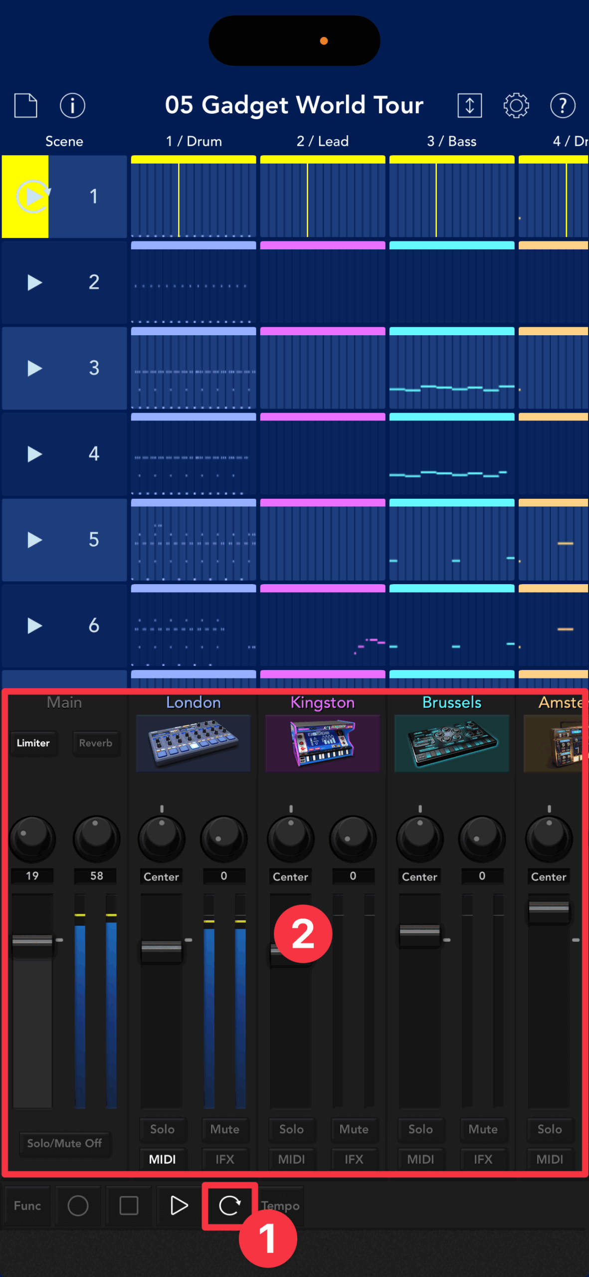 Loop再生はメイン画面でも行えます①。各トラックの音量レベル調整やパンニングなどを行うミキサー②を操作するときに使います。