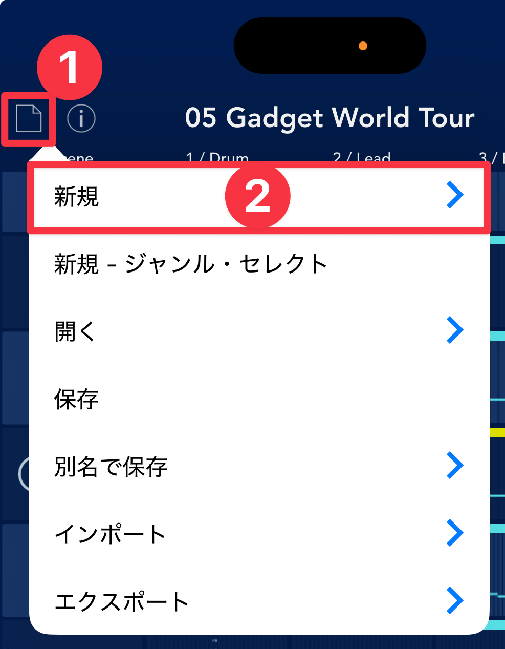 メイン画面左上にあるファイルボタン①をタップし、新規②を選んでください。