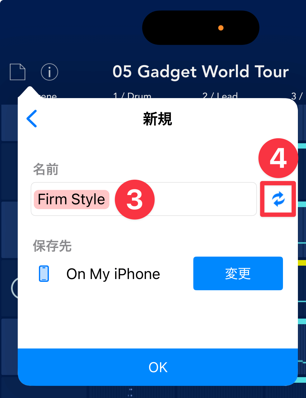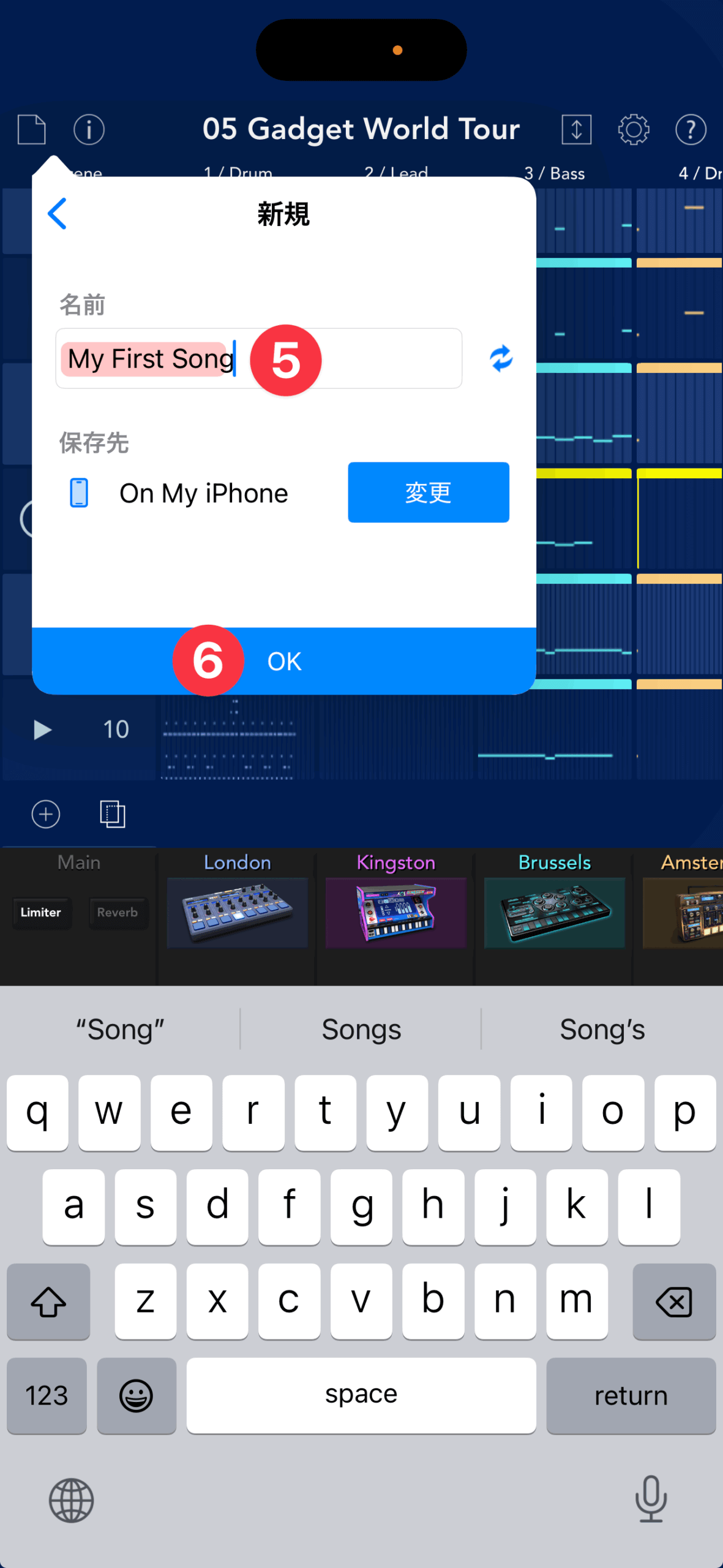 ここではタイトル部分をタップして"My First Song"と入力⑤し、OK⑥をタップしてください。