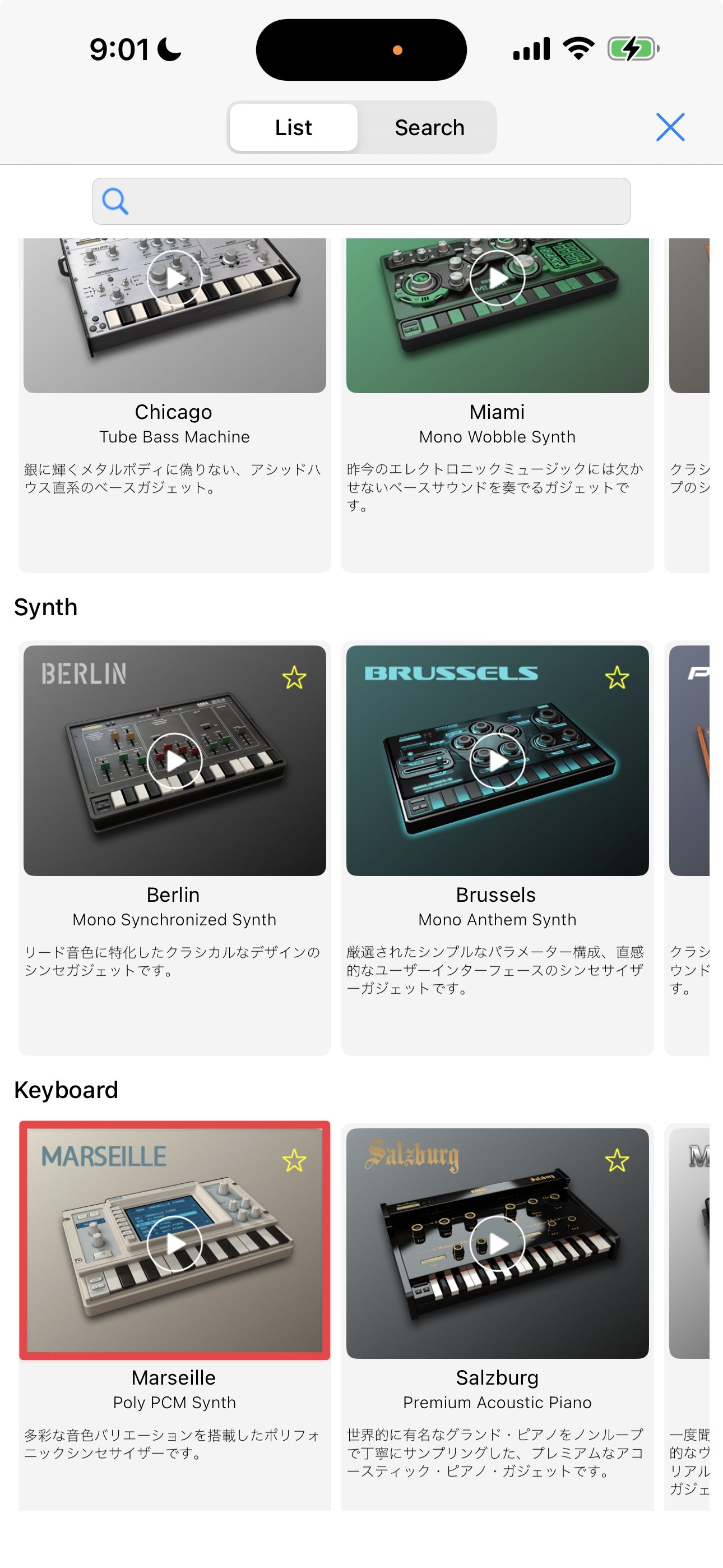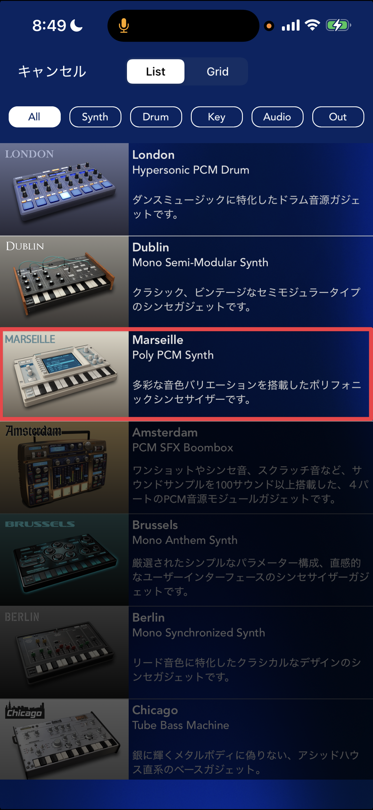ガジェットの選択画面(ガジェットセレクター)でMarseilleをタップしてください。左がKORG Gadget 3、右がKORG Gadget Leのガジェットセレクターです。