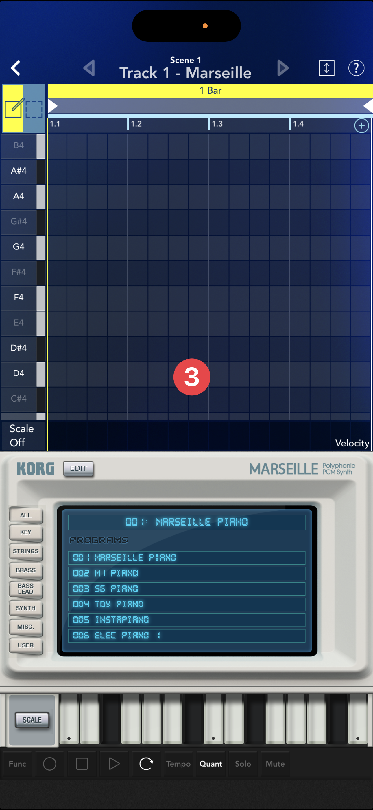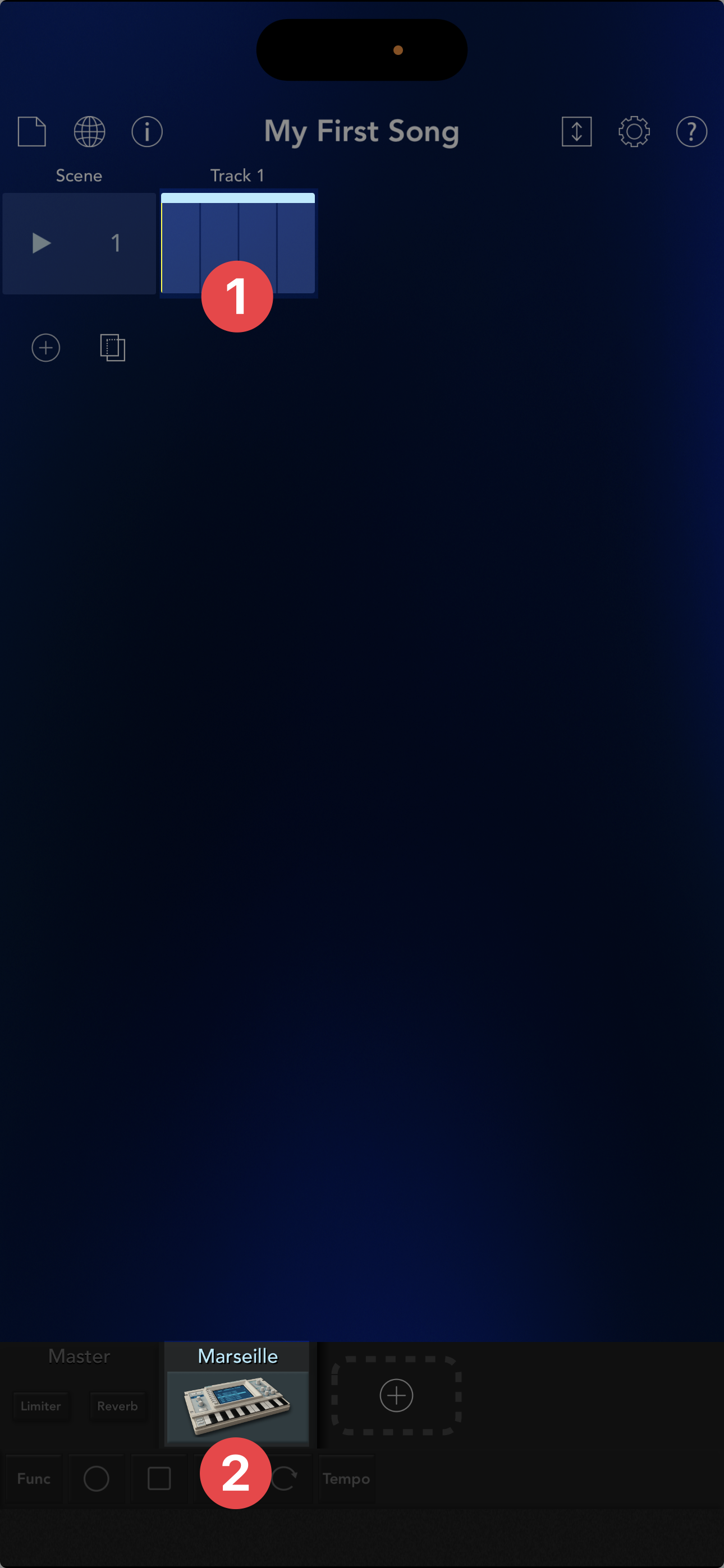 前回のレッスンで開いたメイン画面で、クリップ①またはMarseilleアイコン②をタップしてください。Track 1のエディット画面③が表示されます。