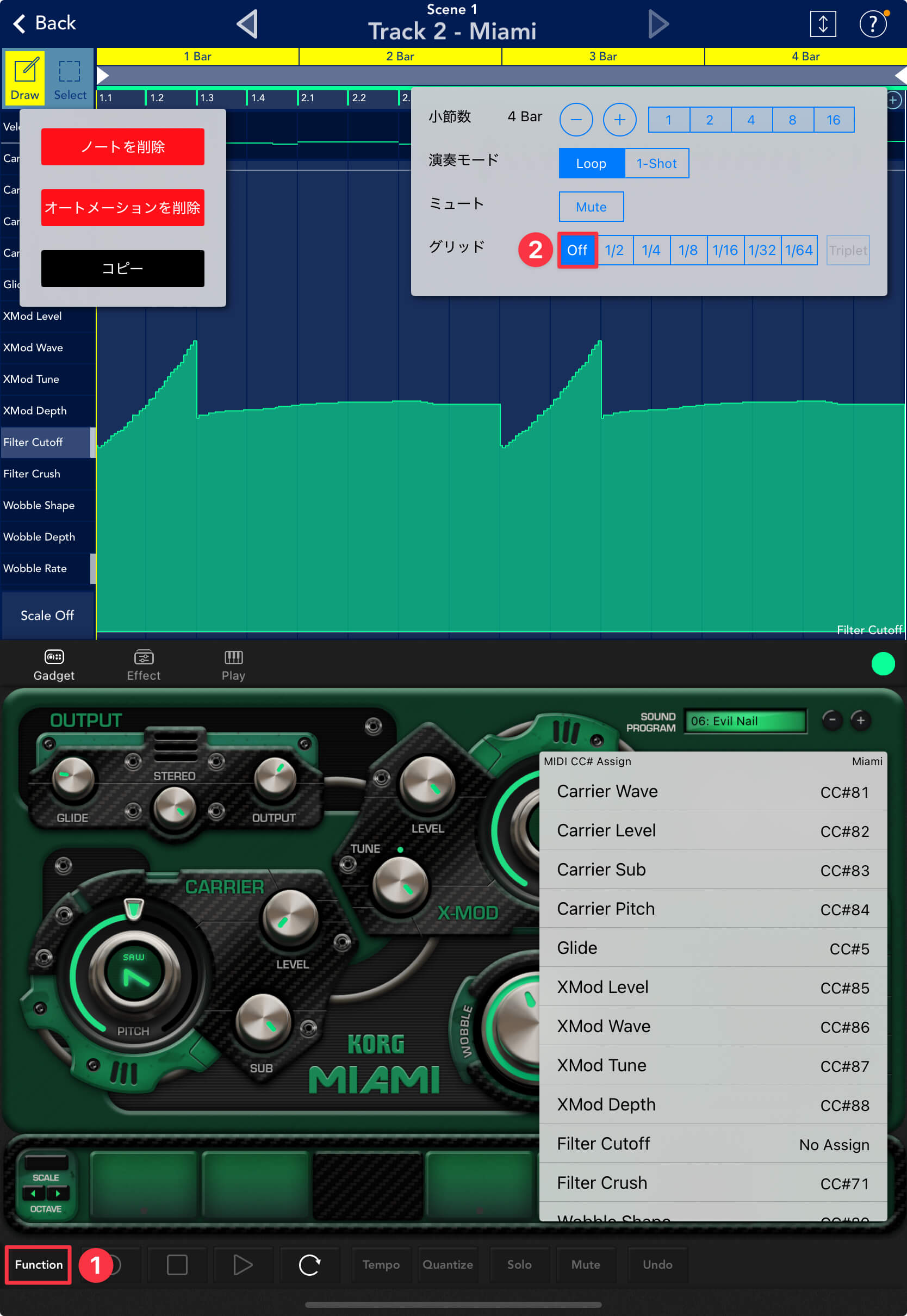このように、オートメーションを細かく書きたいときはグリッドをOFFにしましょう。フッターのFunctionボタン①をタップして、表示されたポップアップのグリッドをOff②にします。