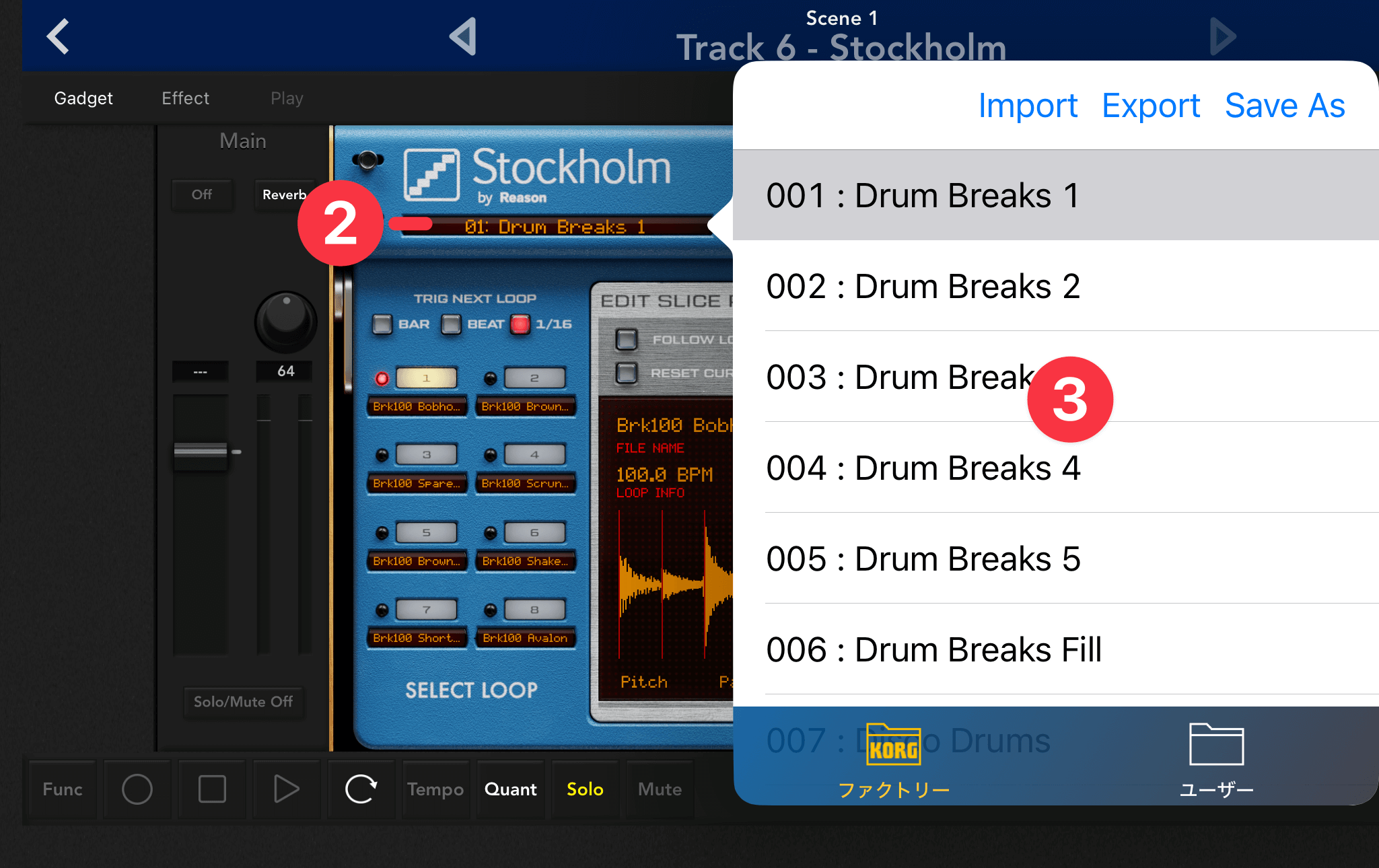 起動したら、ループのプリセットを呼び出してみましょう②。あらかじめ最大8つのループを内蔵した39種類のプリセットが用意されています③。