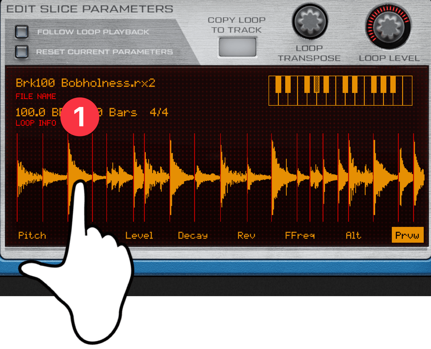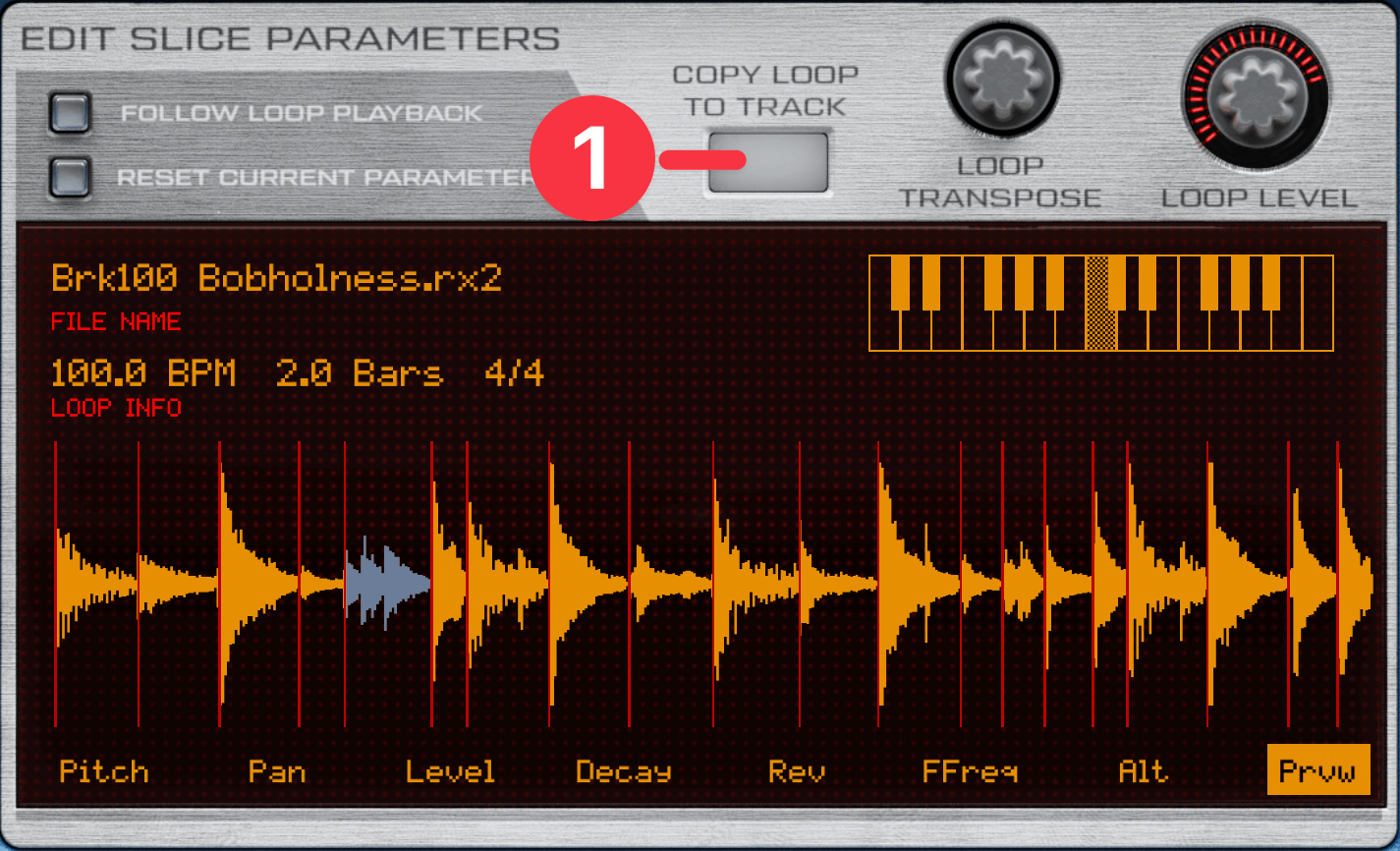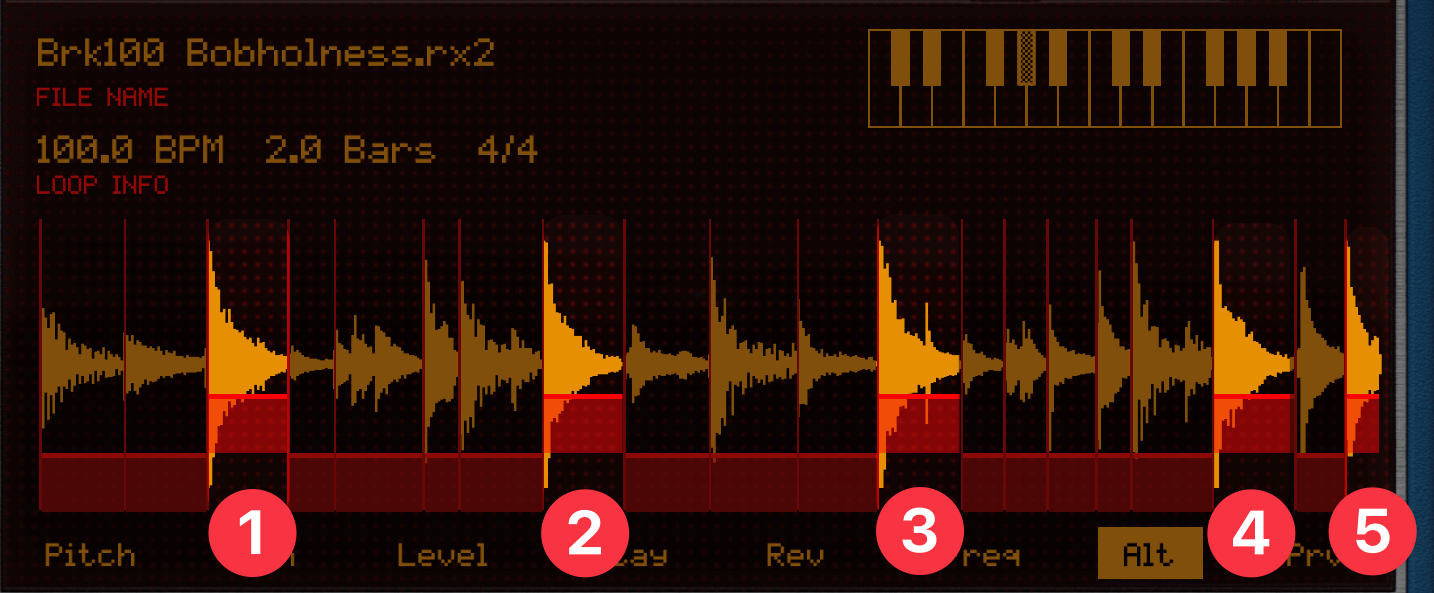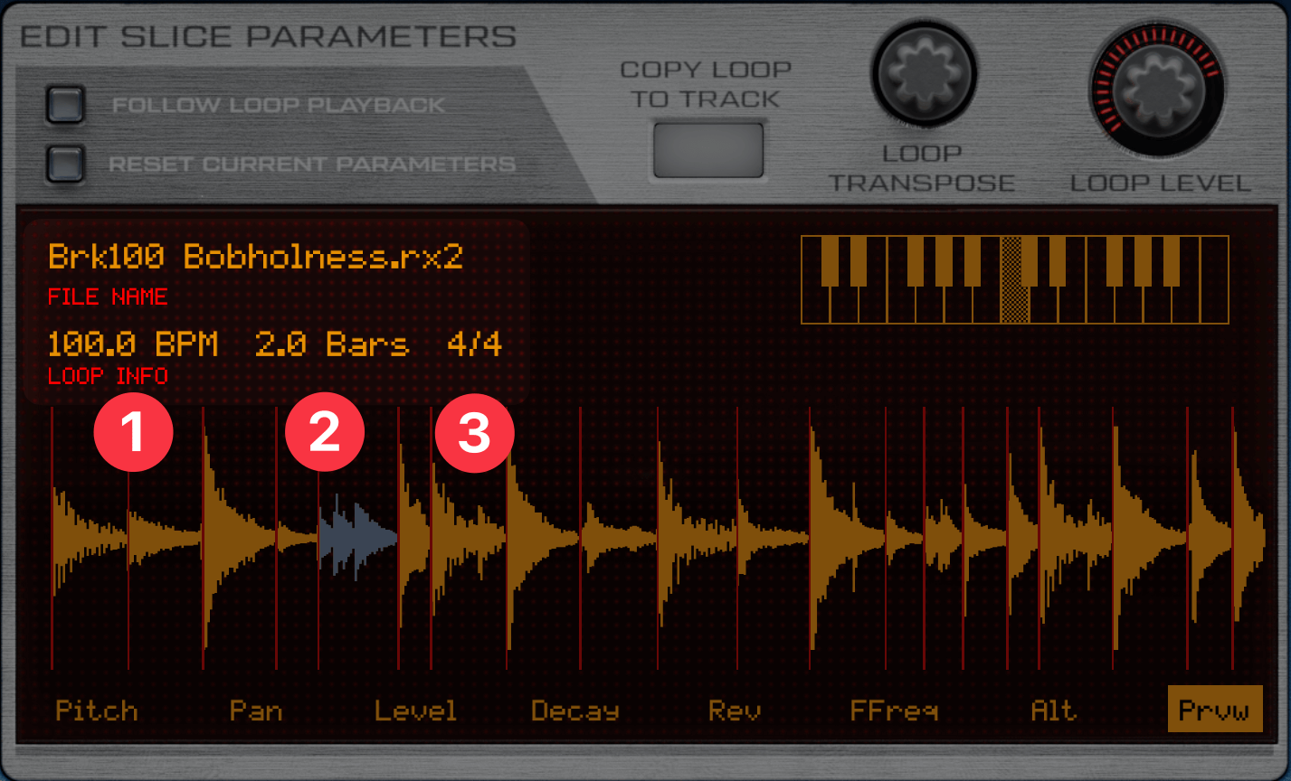 このループ波形(Brk100 Bobholness.rx2)は、Prvwモードで左から3番目のスライス①をタップすると、スネアの音が鳴ります。