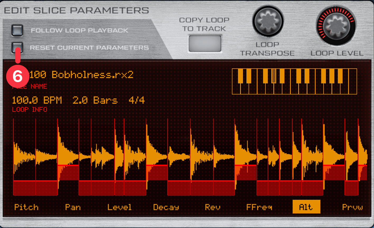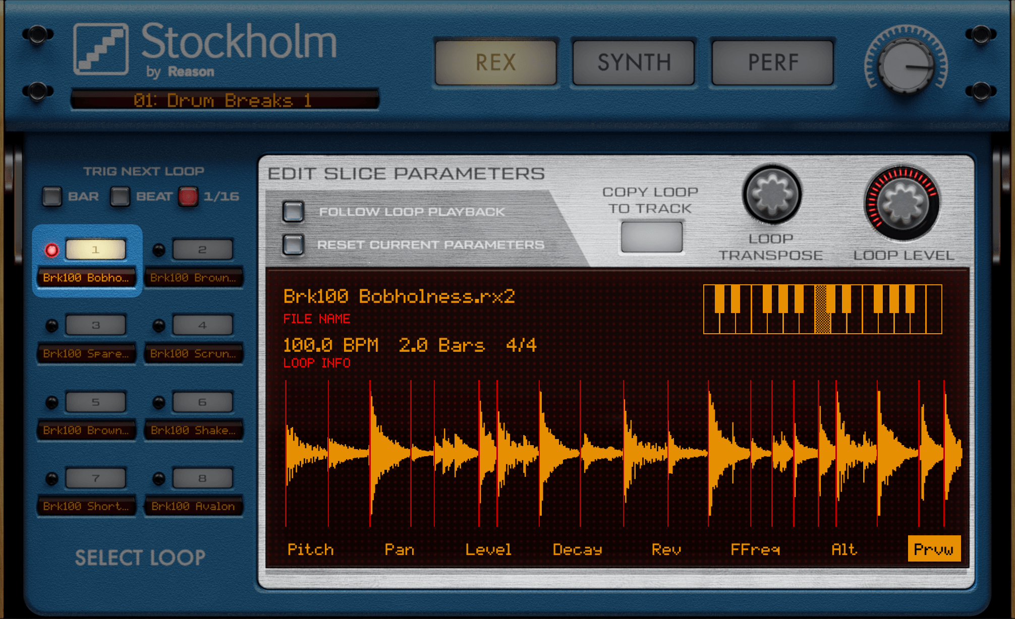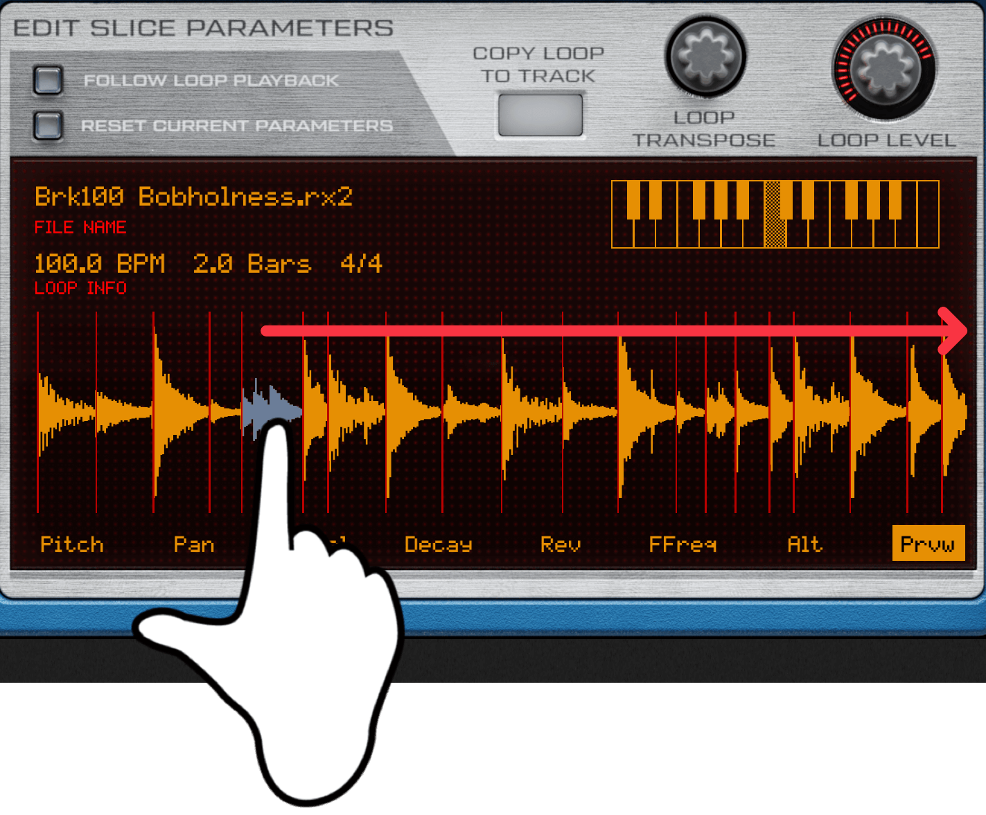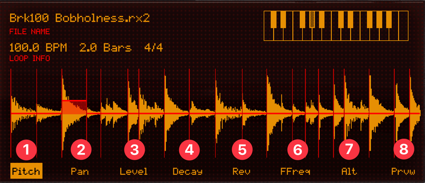 このループ波形(Brk100 Bobholness.rx2)は、Prvwモードで左から3番目のスライス①をタップすると、スネアの音が鳴ります。