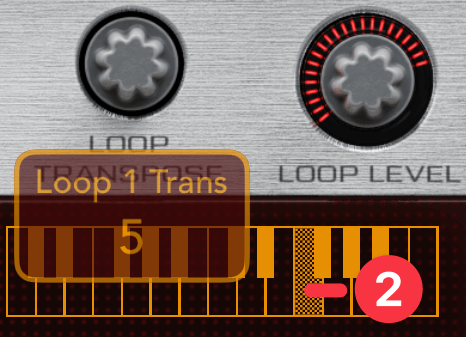 LOOP TRANSPOSEノブ①を回すと、そのままのテンポでループ全体の音程を上げ下げできます。半音単位で1オクターブまで変更できます。