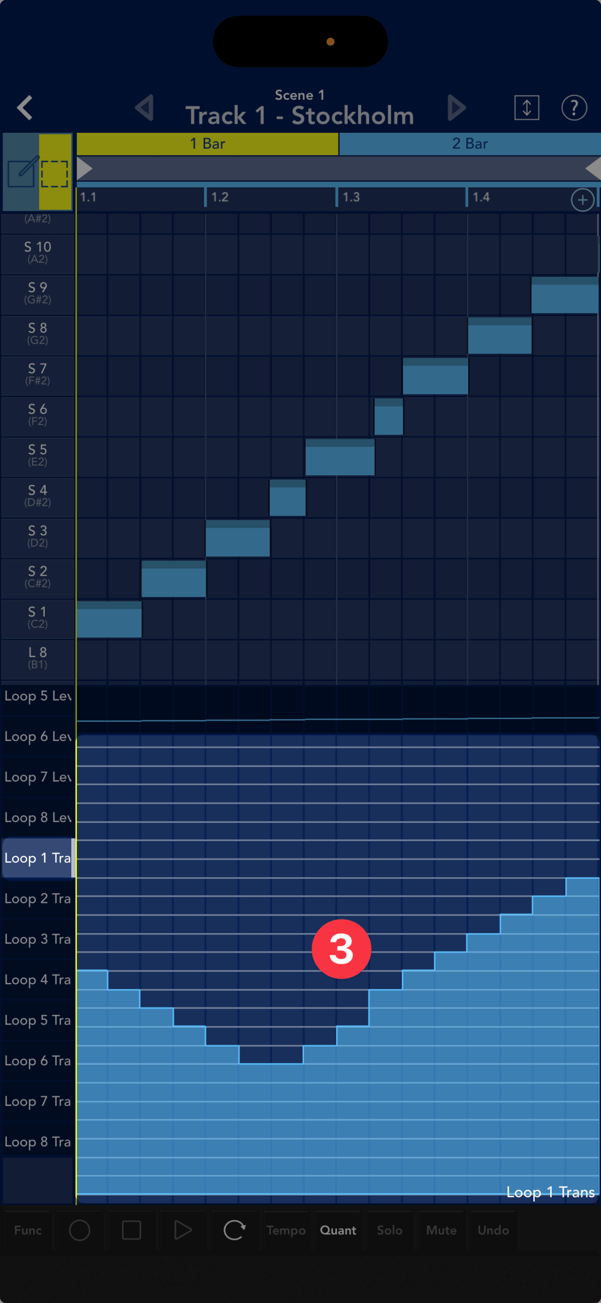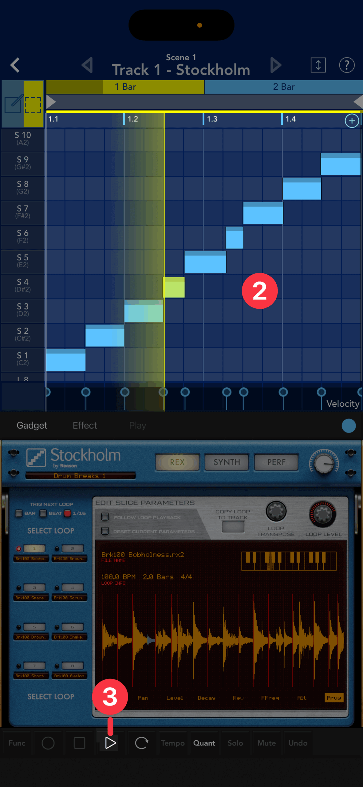 ピアノロールにノートが生まれ②、ループの演奏データがコピーされました。ここでトランスポートのPLAYボタン③をタップすると、ループの最初から再生します。