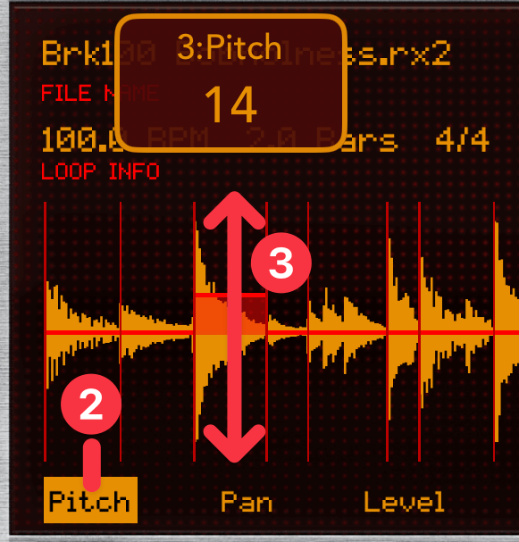 波形の下に並んでいるパラメーターからPitch②をタップすると、スライス上で直接ピッチを上げ下げ③できます。