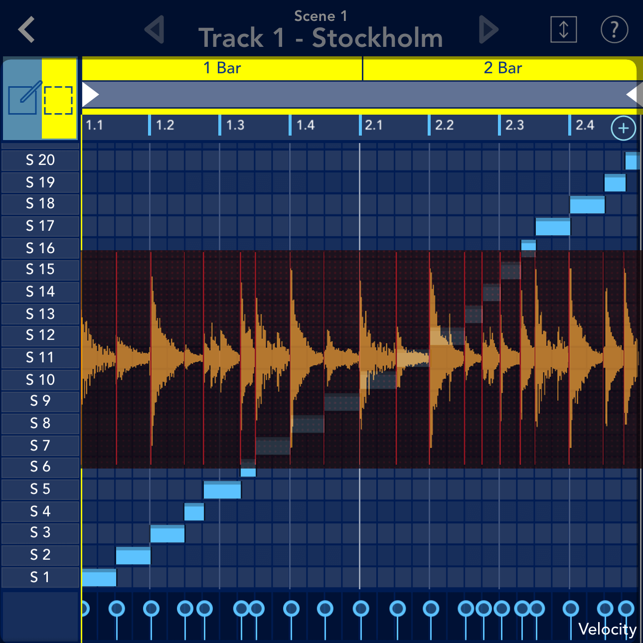 先ほど「このループ波形は2 Bars分の長さ」と述べましたが、そういったループに関する情報は波形ディスプレイに表示されます。